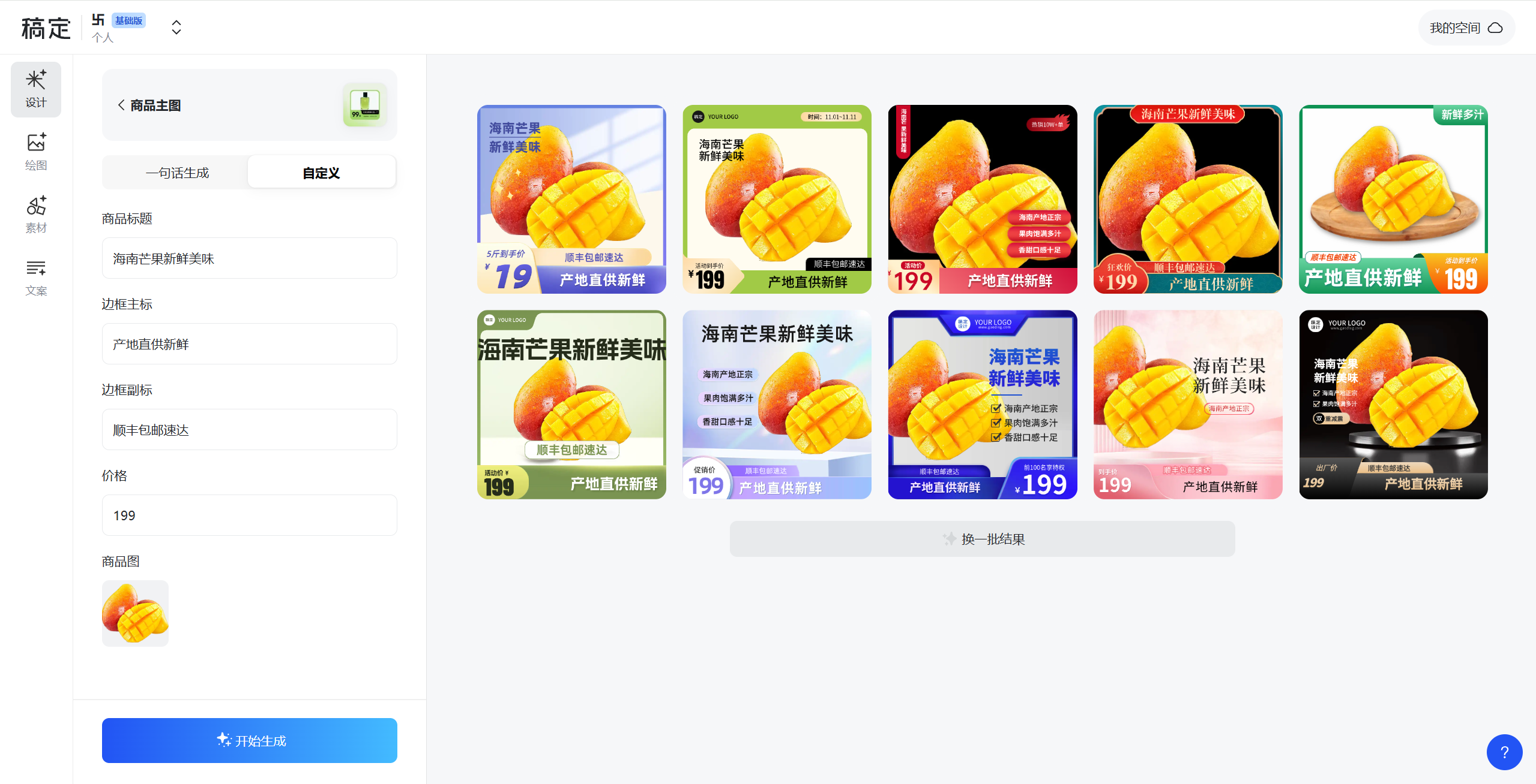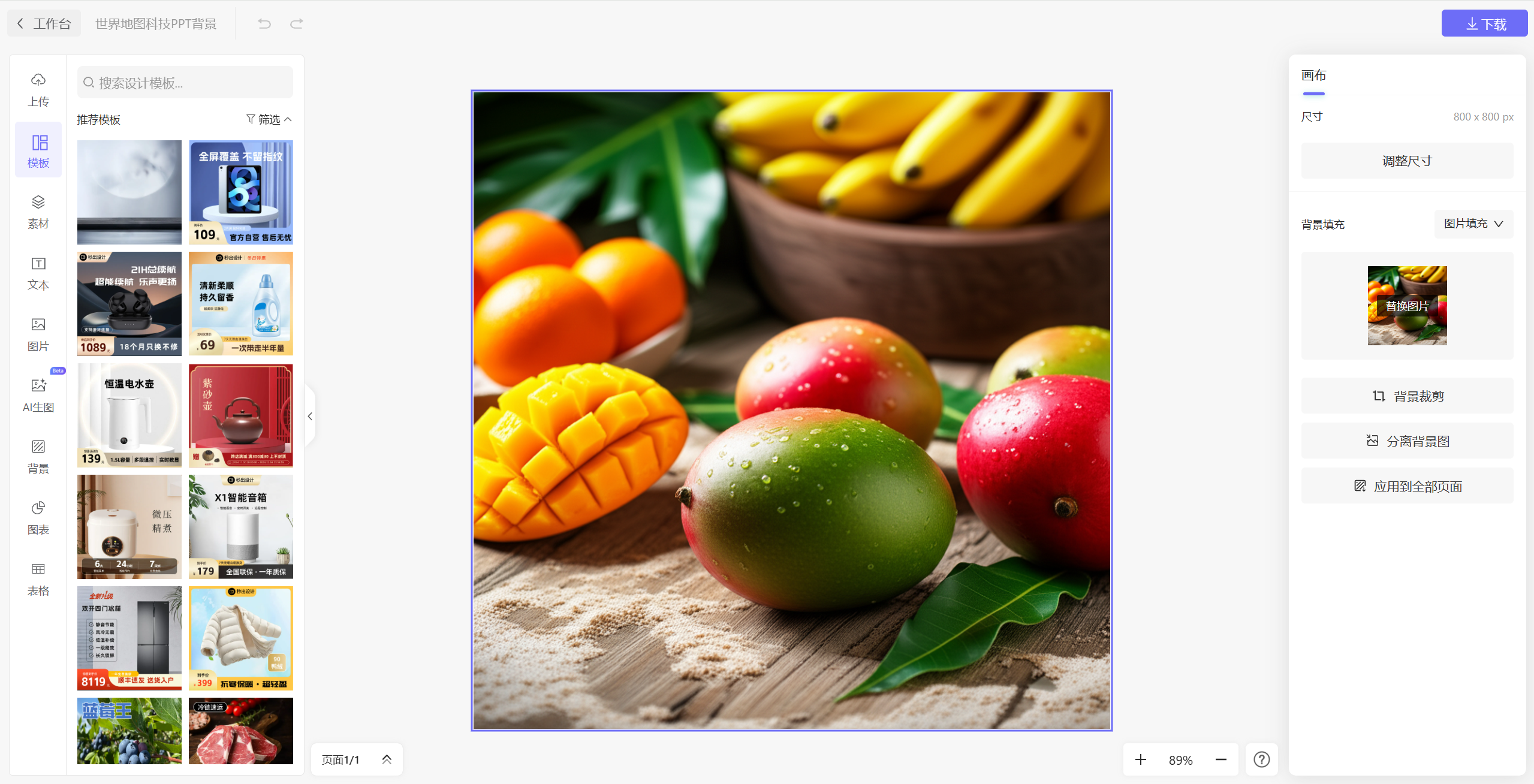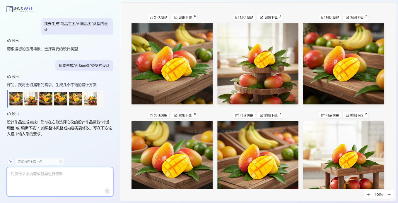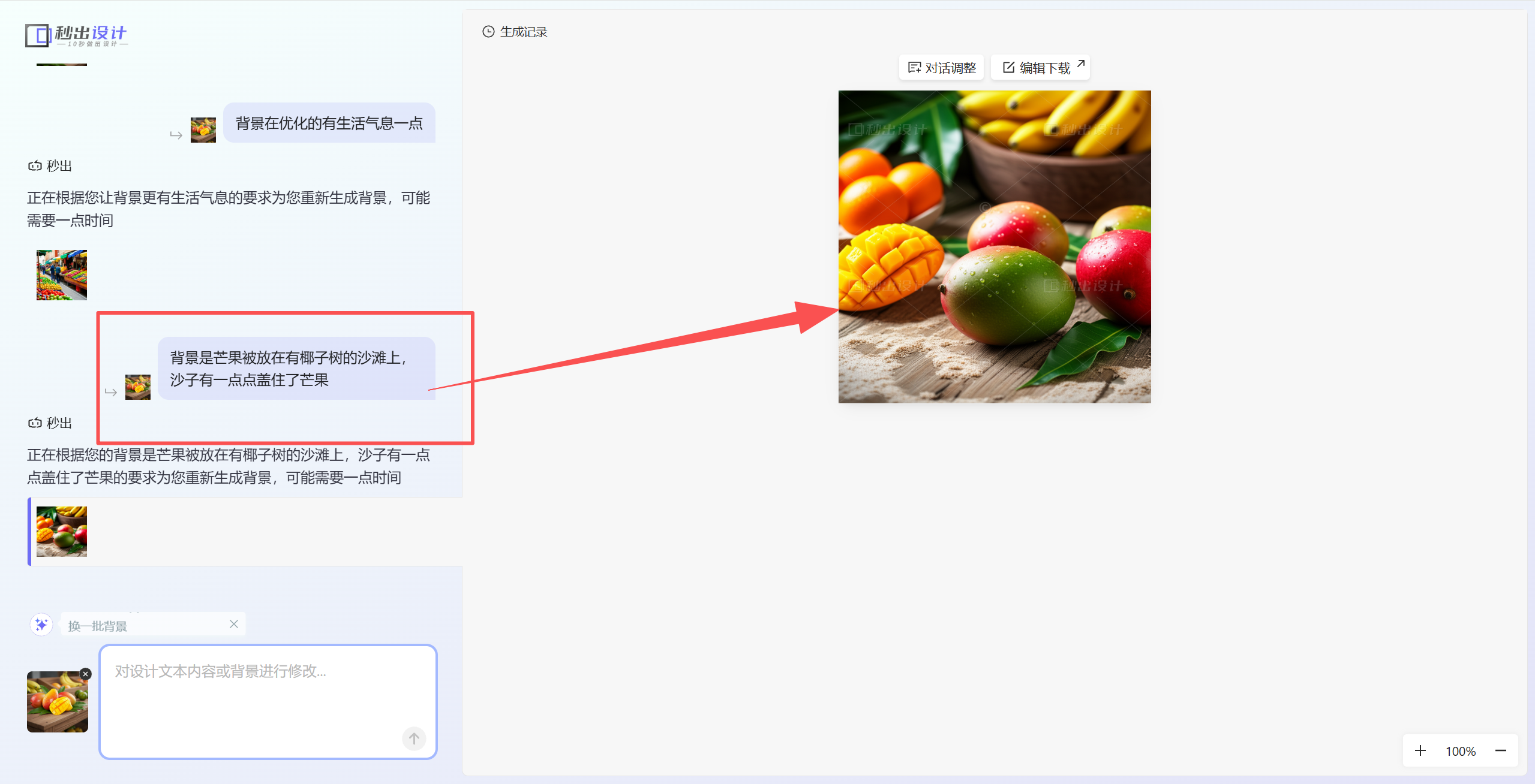 我们打开秒出设计官网,然后将我们准备好的商品图上传,如果是需要抠图的可以选择ai智能抠图。然后输入文案【给这个商品配上合适的背景图】,如果你有具体的要求也可以描述,例如【背景是阳光沙滩,芒果埋在沙滩里......】