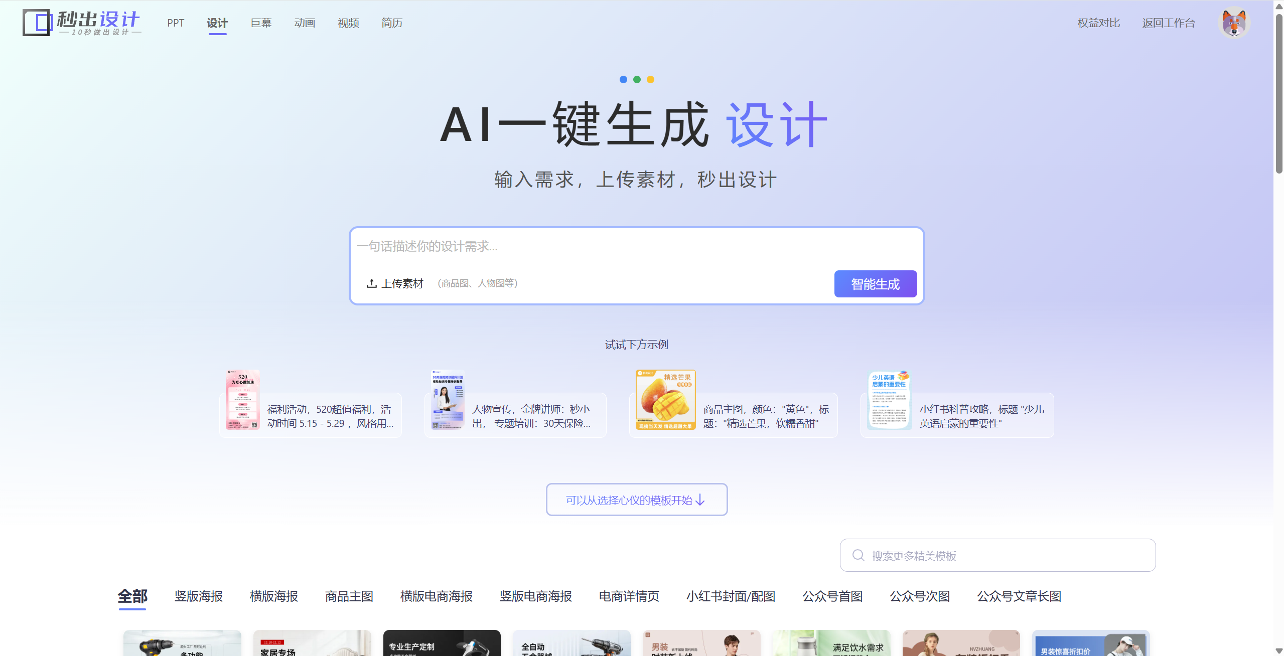 秒出设计是专注于做海报设计的网站,适合运营、自媒体博主以及电商等。它支持一键生成AI商品图,并且不需要学习专业的提示词就可以做,对新手小白也很友好。