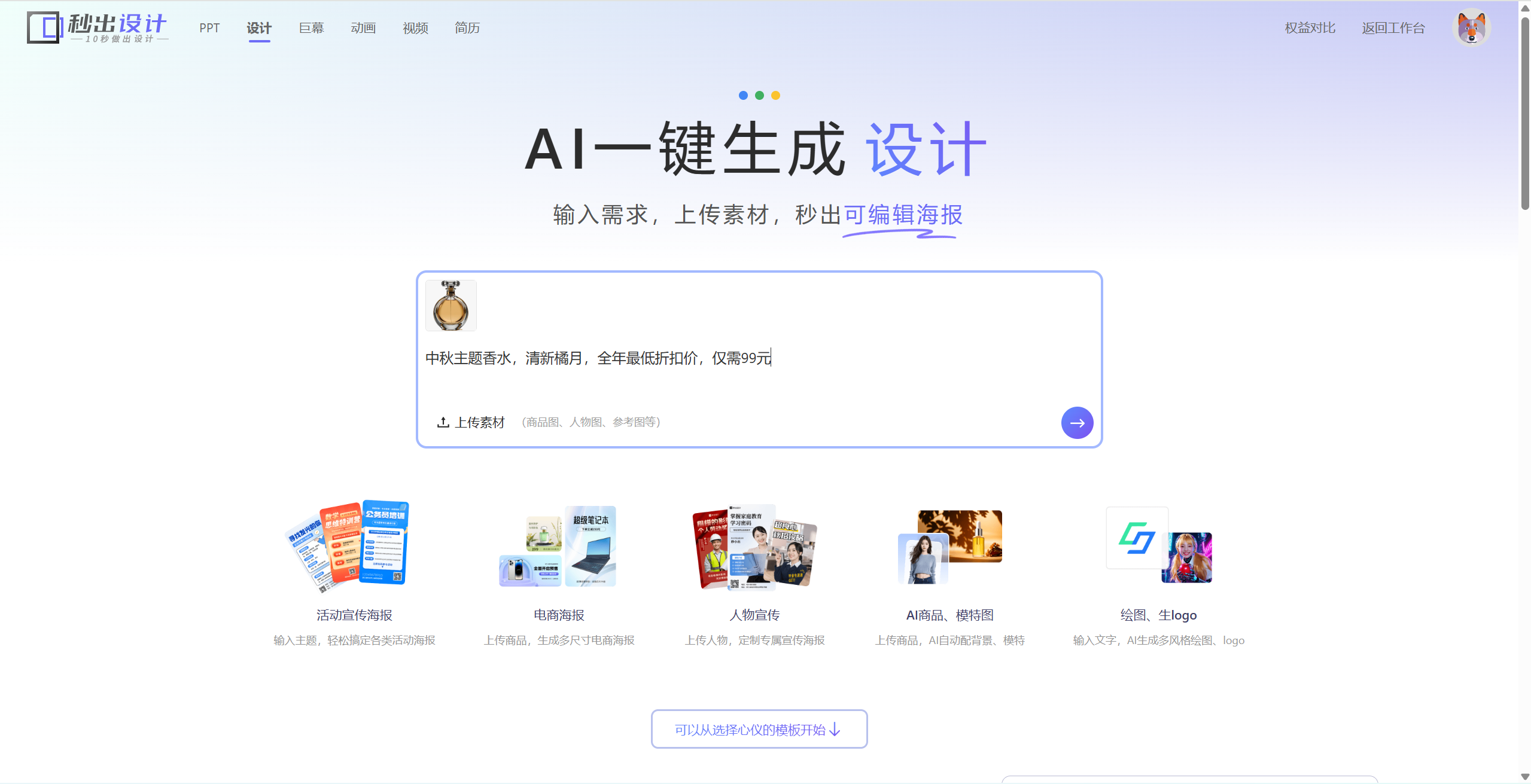 我们所用到的工具就是秒出设计——一款AI制作海报工具,包括我们的电商、邀请函、宣传海报等等不同的类型。接下来我们就来详细看看操作流程吧!