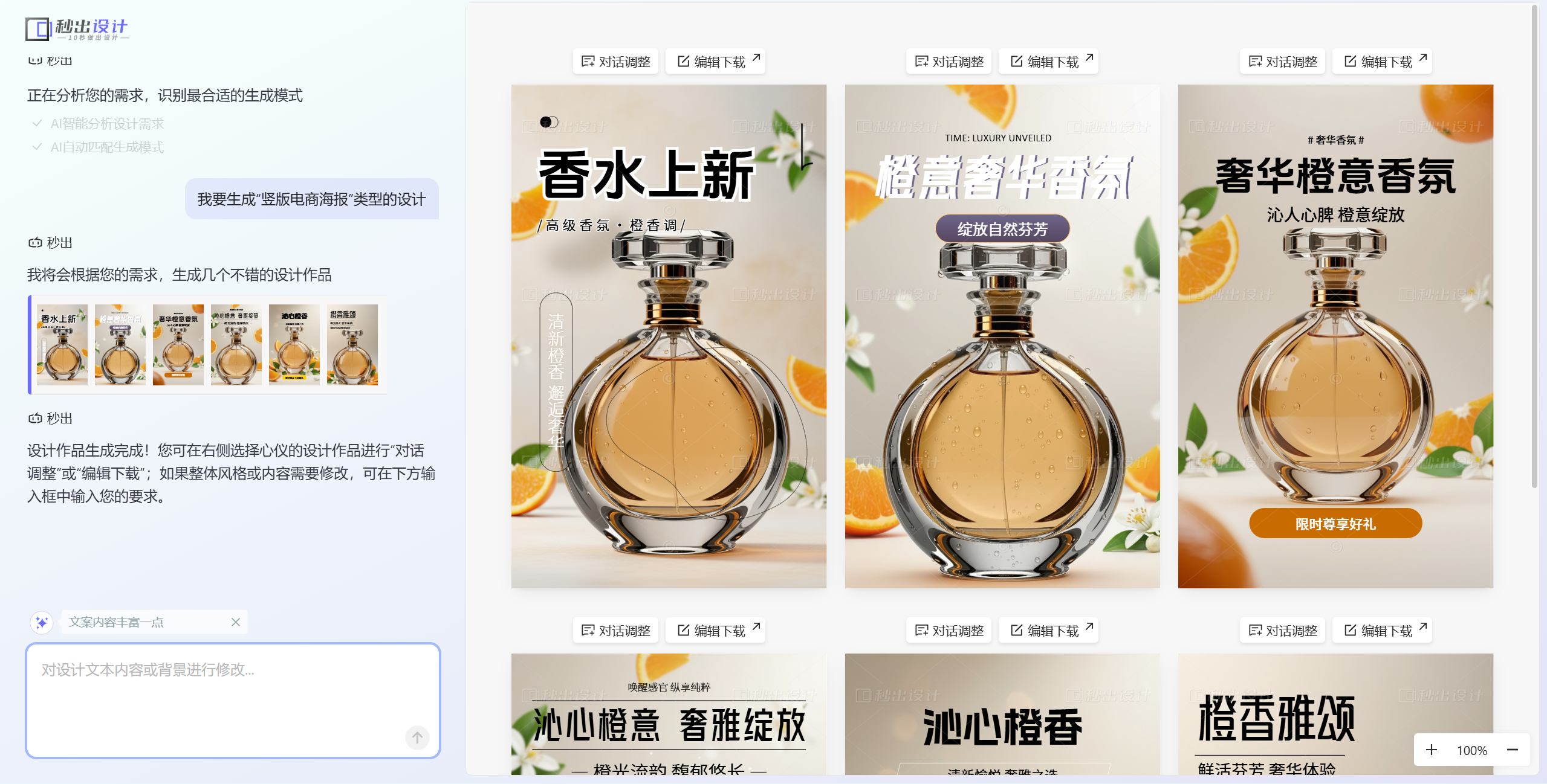 我们的秒出设计做出来的海报是可以修改的,我们可以在编辑页面对生成的海报进行调整。海报调整的工具与其他的海报制作平台工具相似,没有学习成本。但是在编辑的时候有ai帮助编辑,可以通过和ai对话来修改设计。