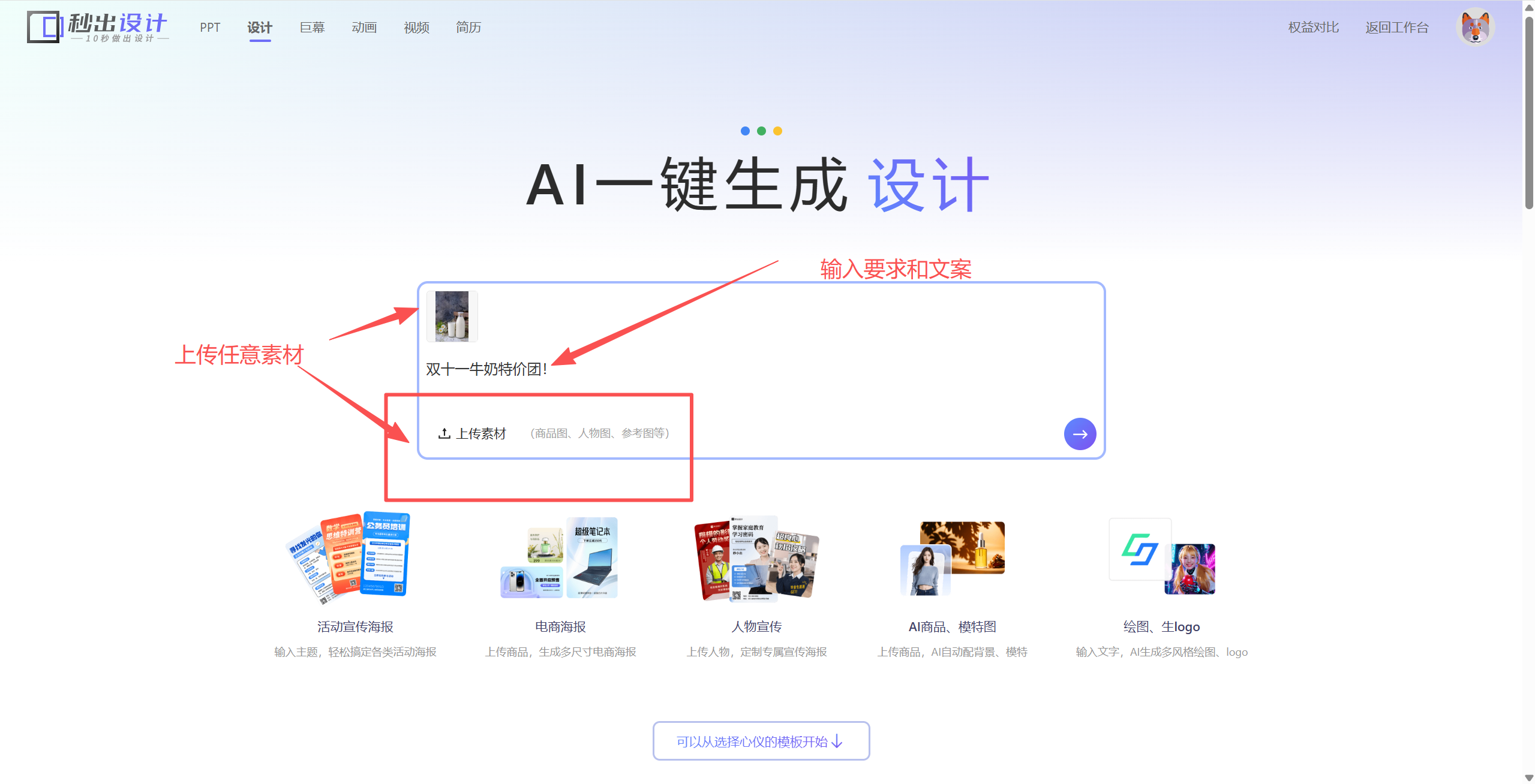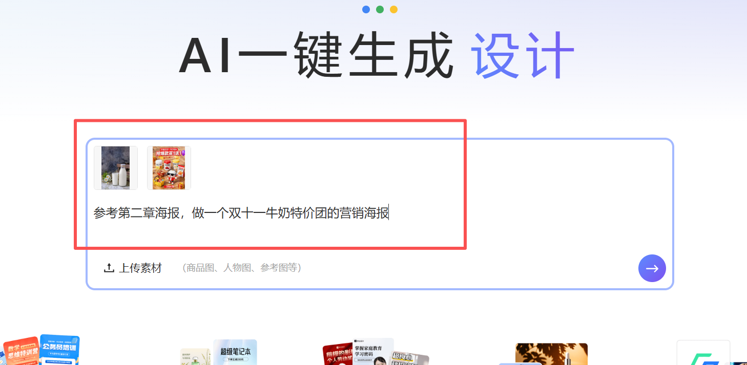 另外就是秒出设计也支持上传参考图生成海报。有的时候我们在看到了别人的海报的时候,第一反应可能就是我要做一个同款出来。秒出设计就能帮你做到这一点。只需要在首页上传参考图,然后告诉ai参考上传图片生成一张你需要的海报即可。