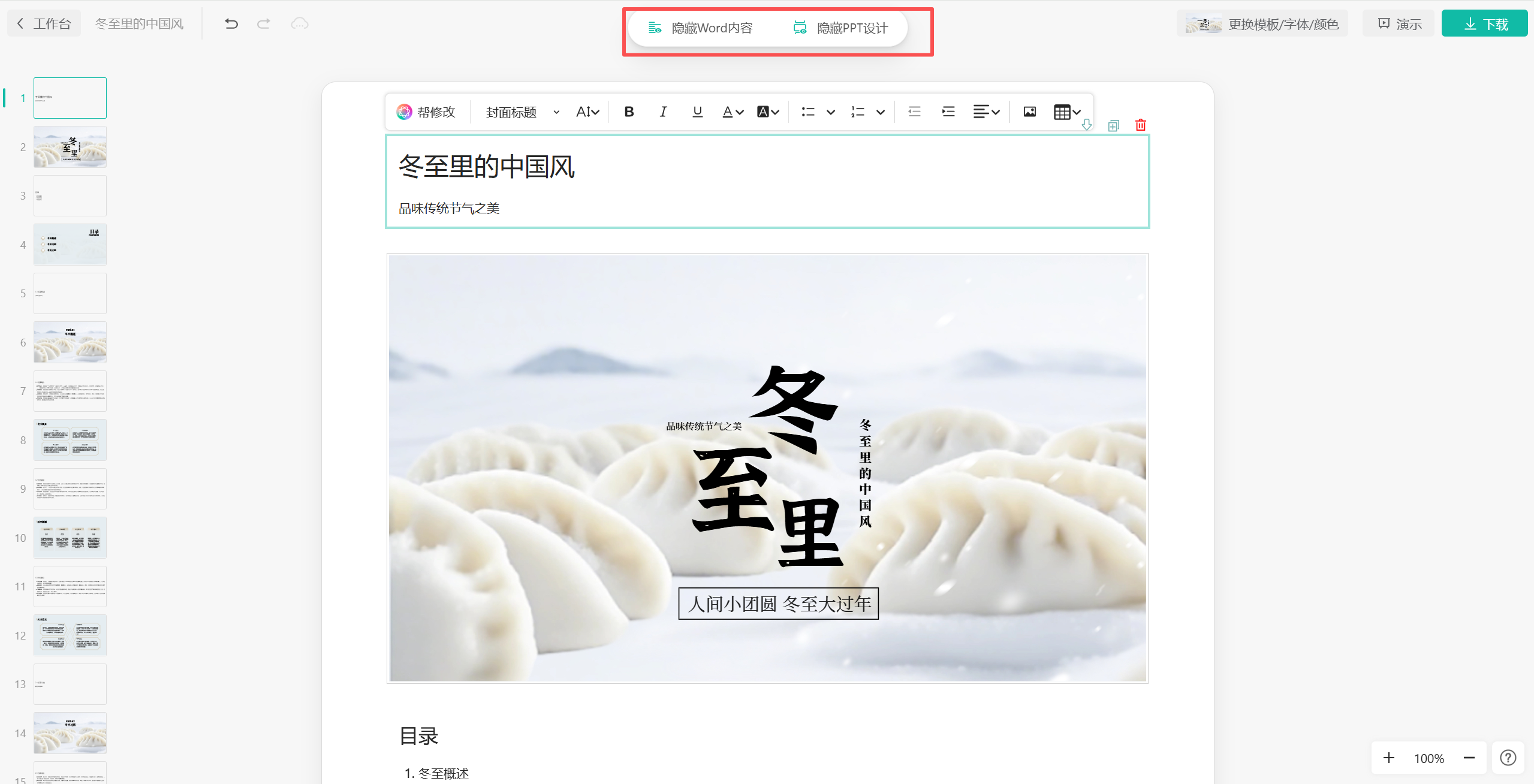 生成之后我们就可以进入在线编辑了,秒出PPT的在线是采用的word的形式,也就是整个编辑页面可以看成是一个大的word文档,并且还有三种模式可以选: