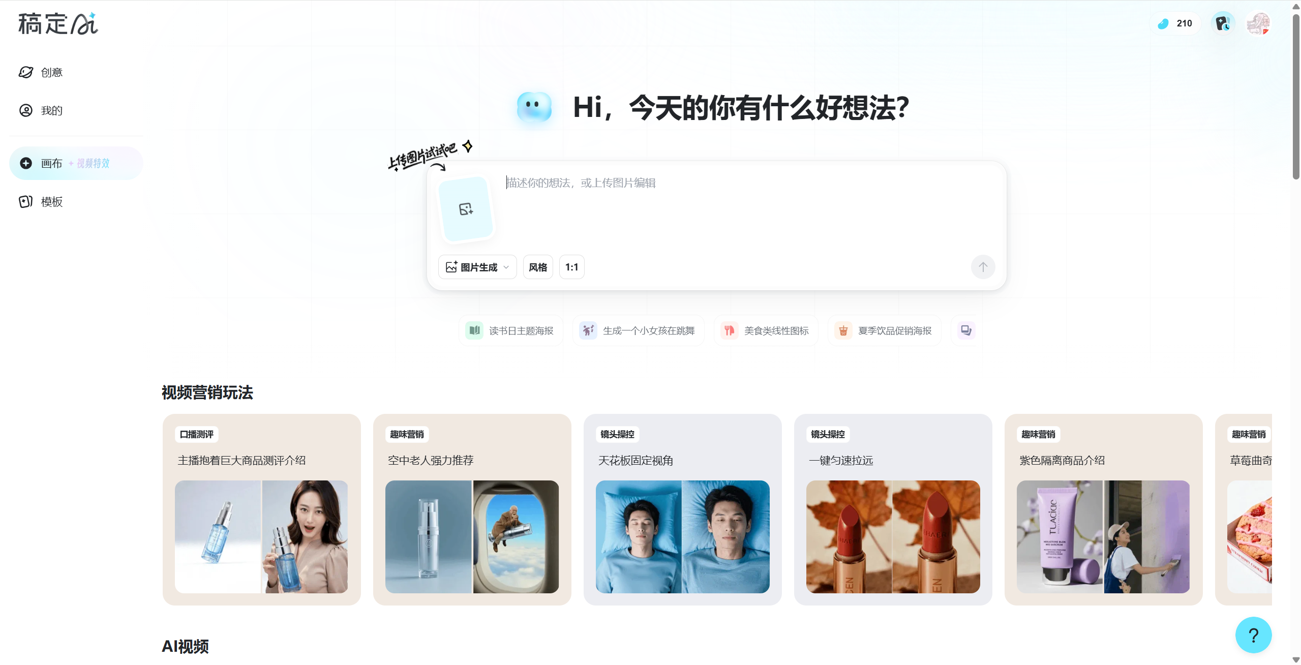 我们在稿定设计里面找到搞定ai,然后新建画布,这里就能看到ai生图的窗口了。它的ai生成输入窗口和即梦的比较类似,可以上传参考图等等。