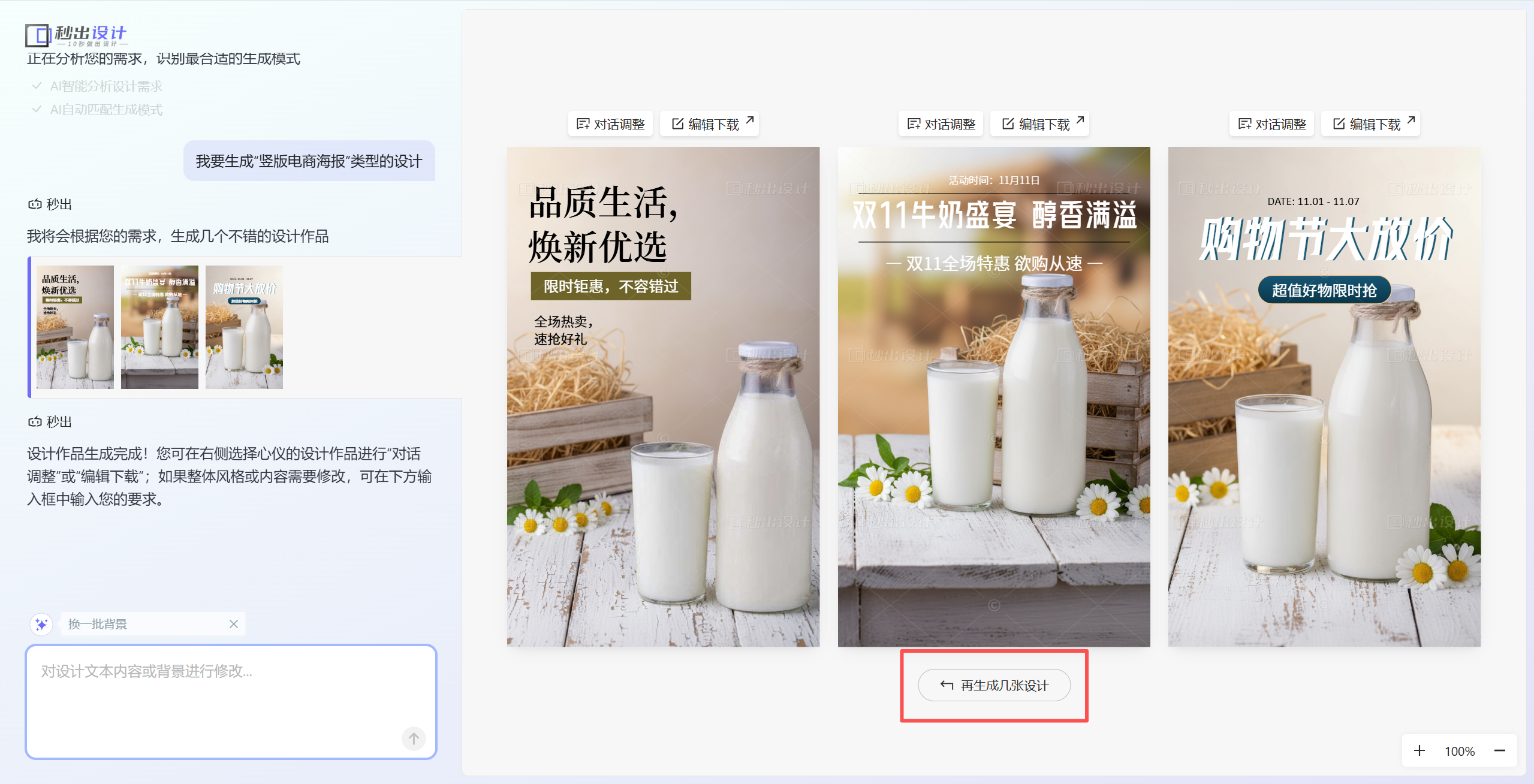 点击生成之后,一次性会生成三张不同的海报,如果对当前生成的三张海报不满意,那么可以点击下面的【在生成几张设计】,ai就会重新生成海报了。当然了,前面的海报都是被保留下来的,我们可以在历史记录里面看到这些海报。