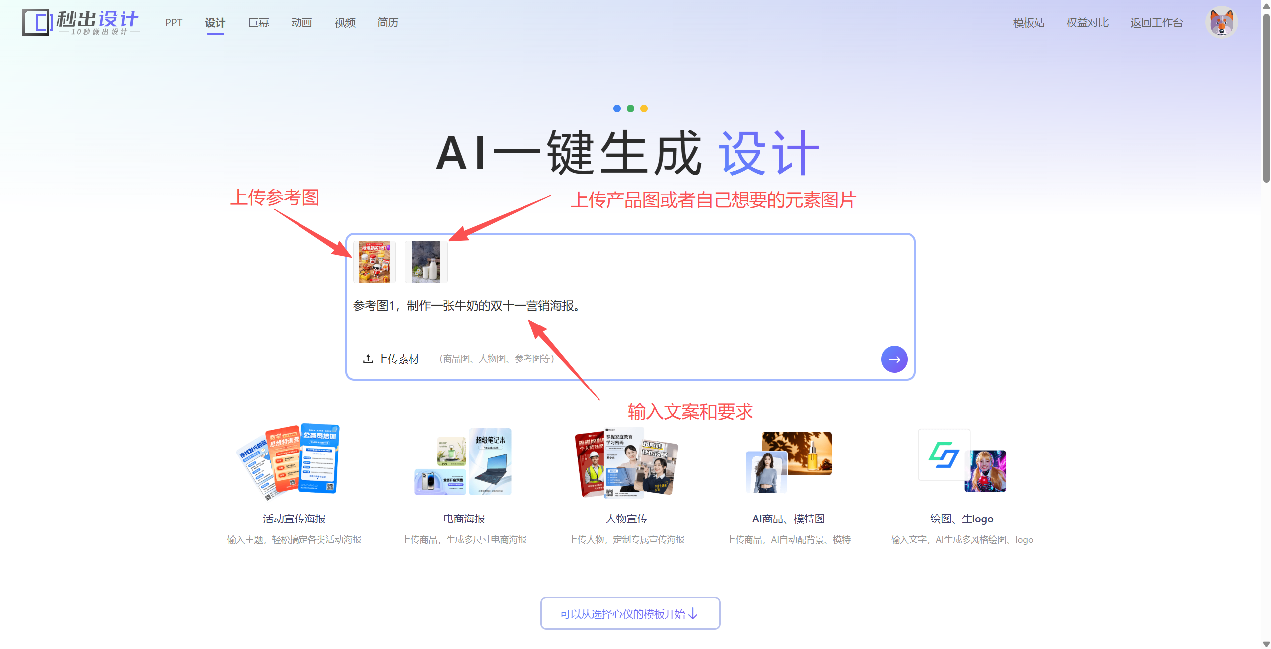 我们直接来到秒出设计的首页,在这里,我可以在首页的输入框里面放入我所有的内容和要求。这里不管你是要主题生成还是参考图生成又或者是需要排版设计,这里都是直接放的,我们只需要跟着写出自己的需求即可。