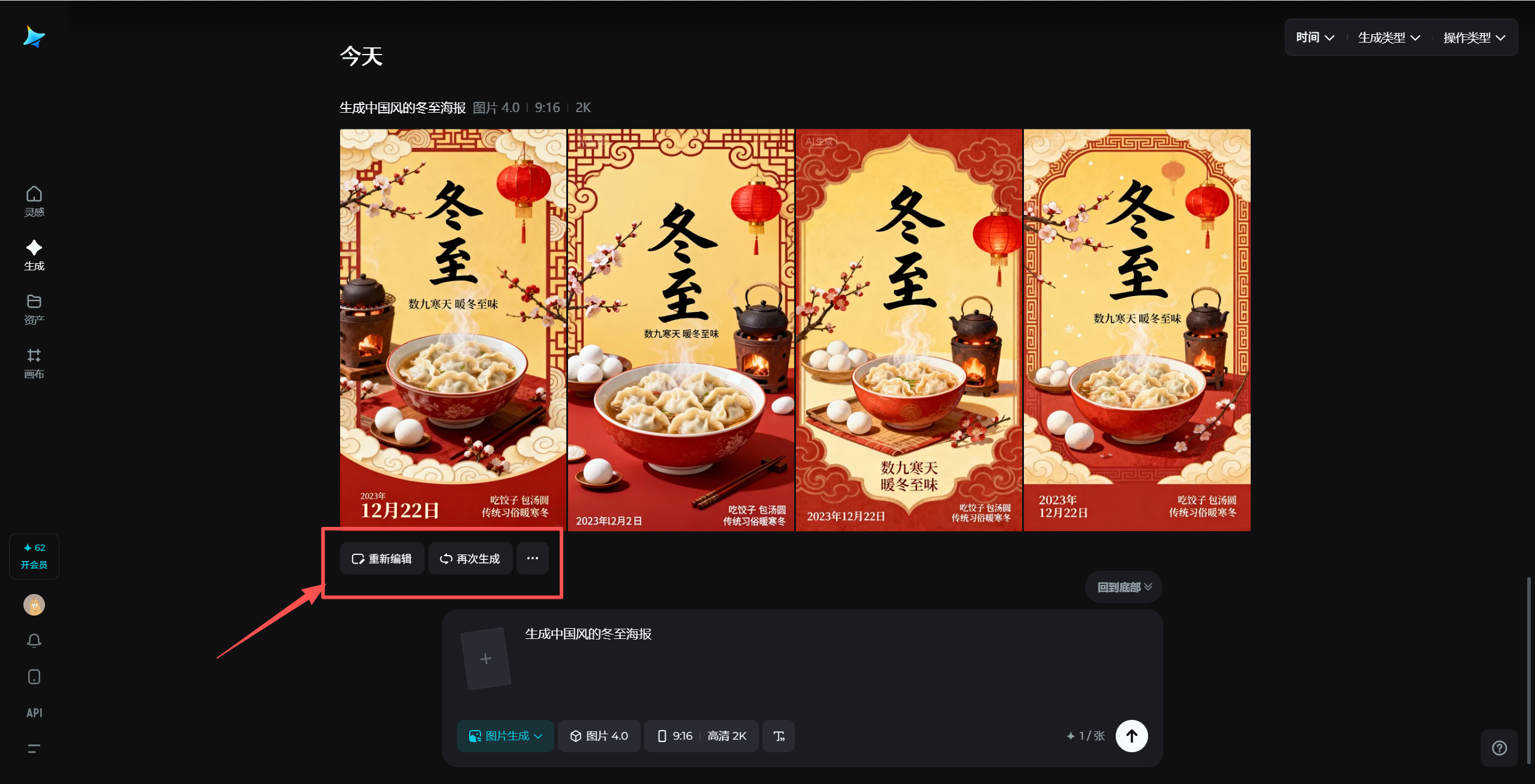 即梦一次性会生成4张不同的海报,如果不满意我们可以重新生成。当然了,也可以选择对我们的提示词进行修改然后生成,直到满意为止。