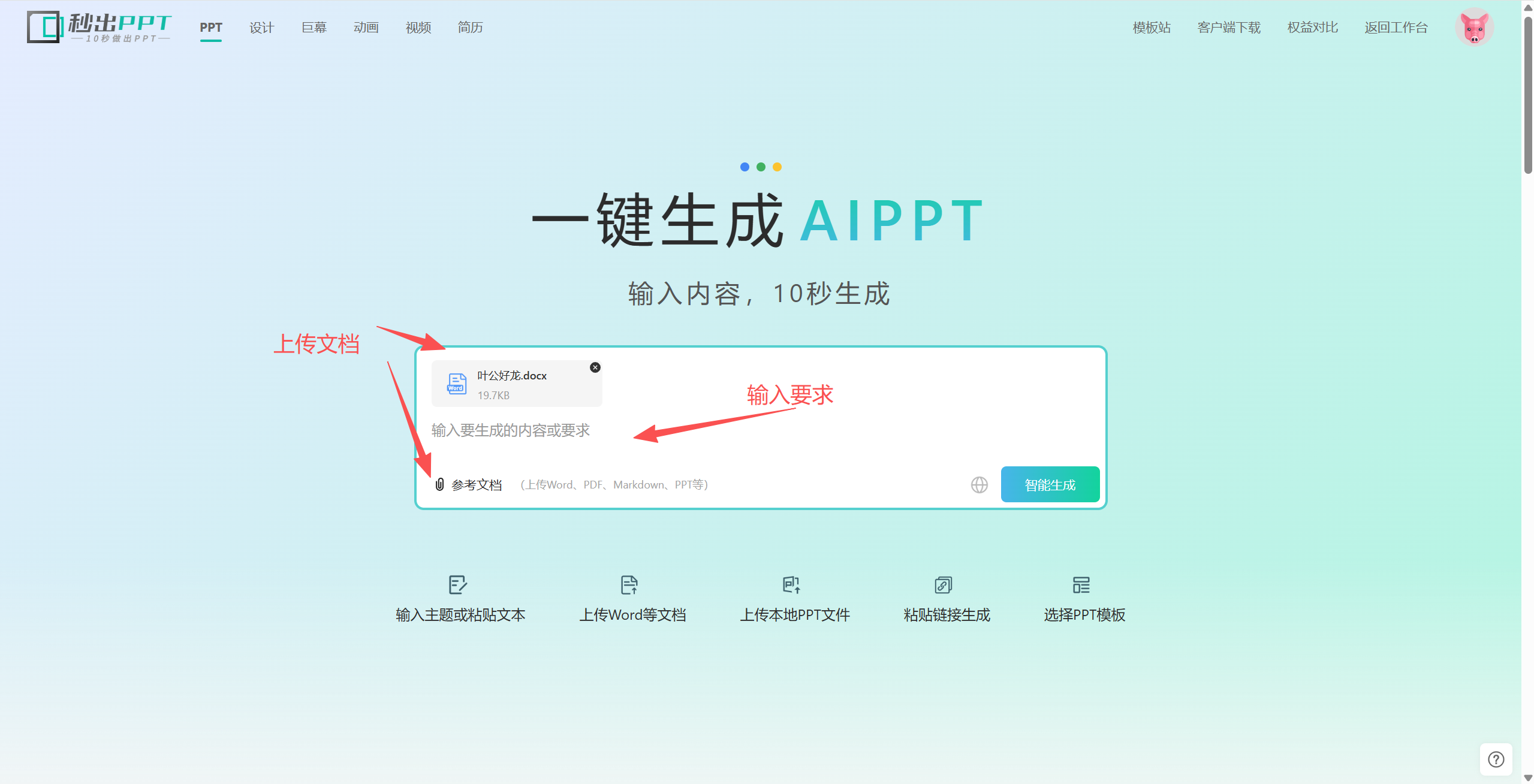 接着我们在首页上传我们的word文档,然后直接点击生成。如果你对生成有其他要求可以在输入框里面输入你的要求。