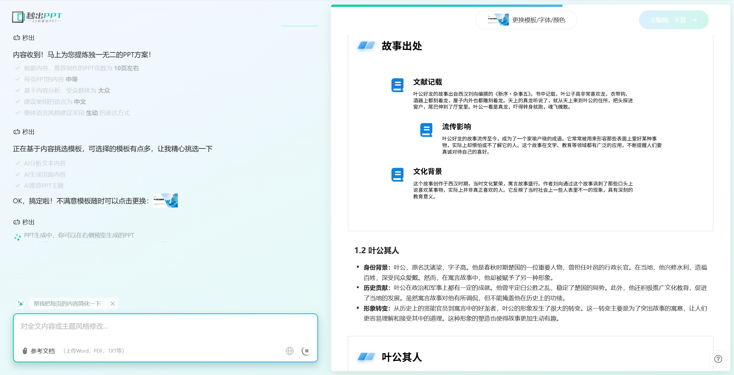 然后我们继续点击生成,秒出ai会根据你的文本内容搭配合适的模板以及排版设计,让ppt更加的符合我们的需求