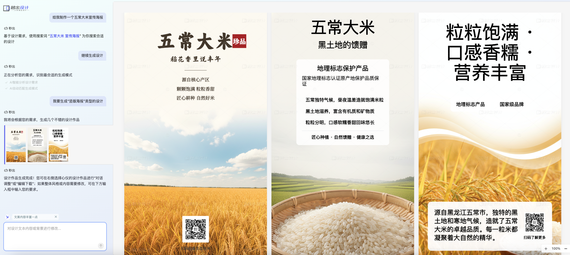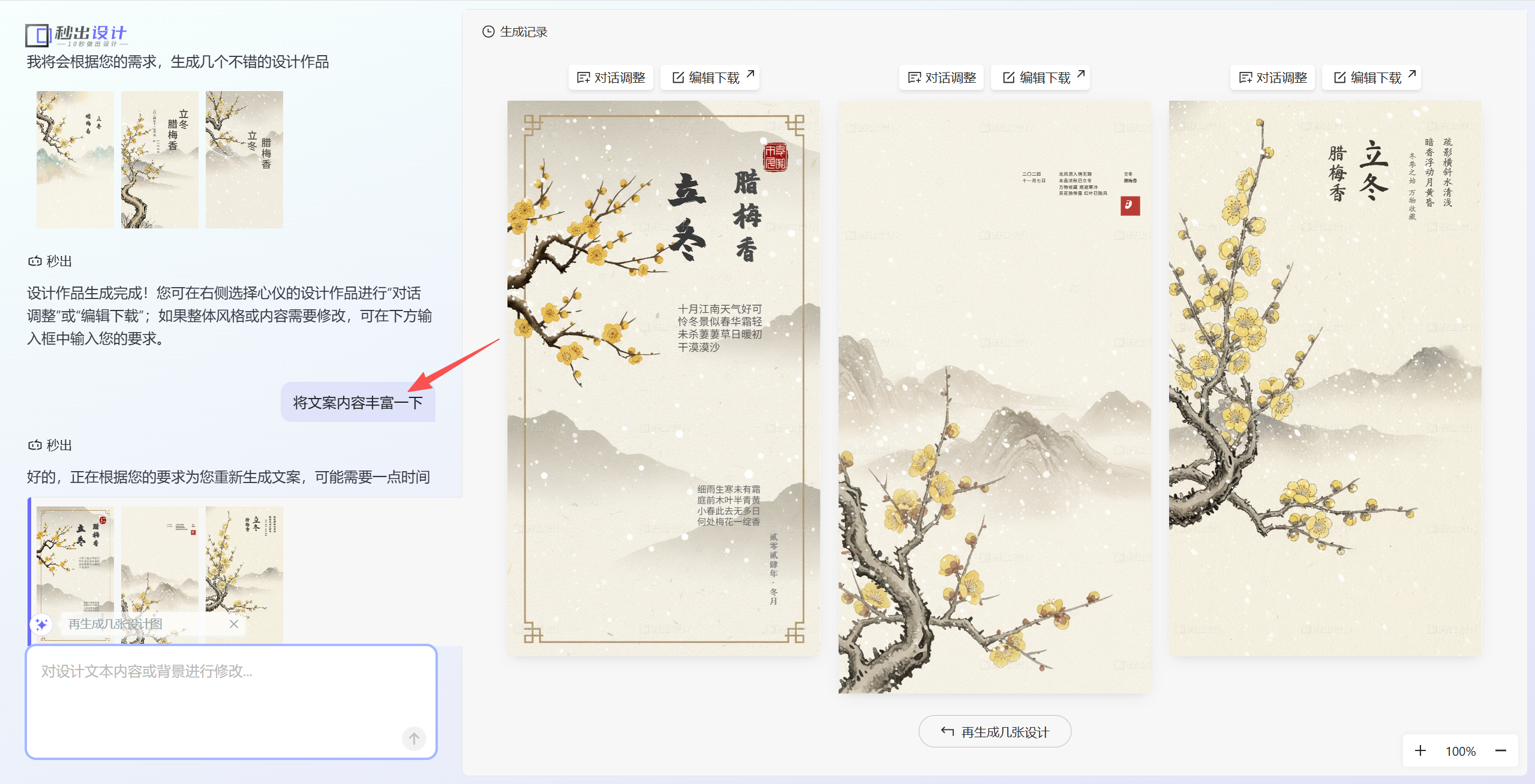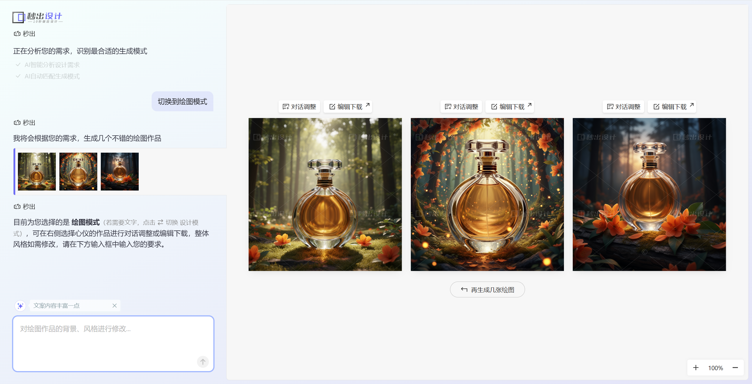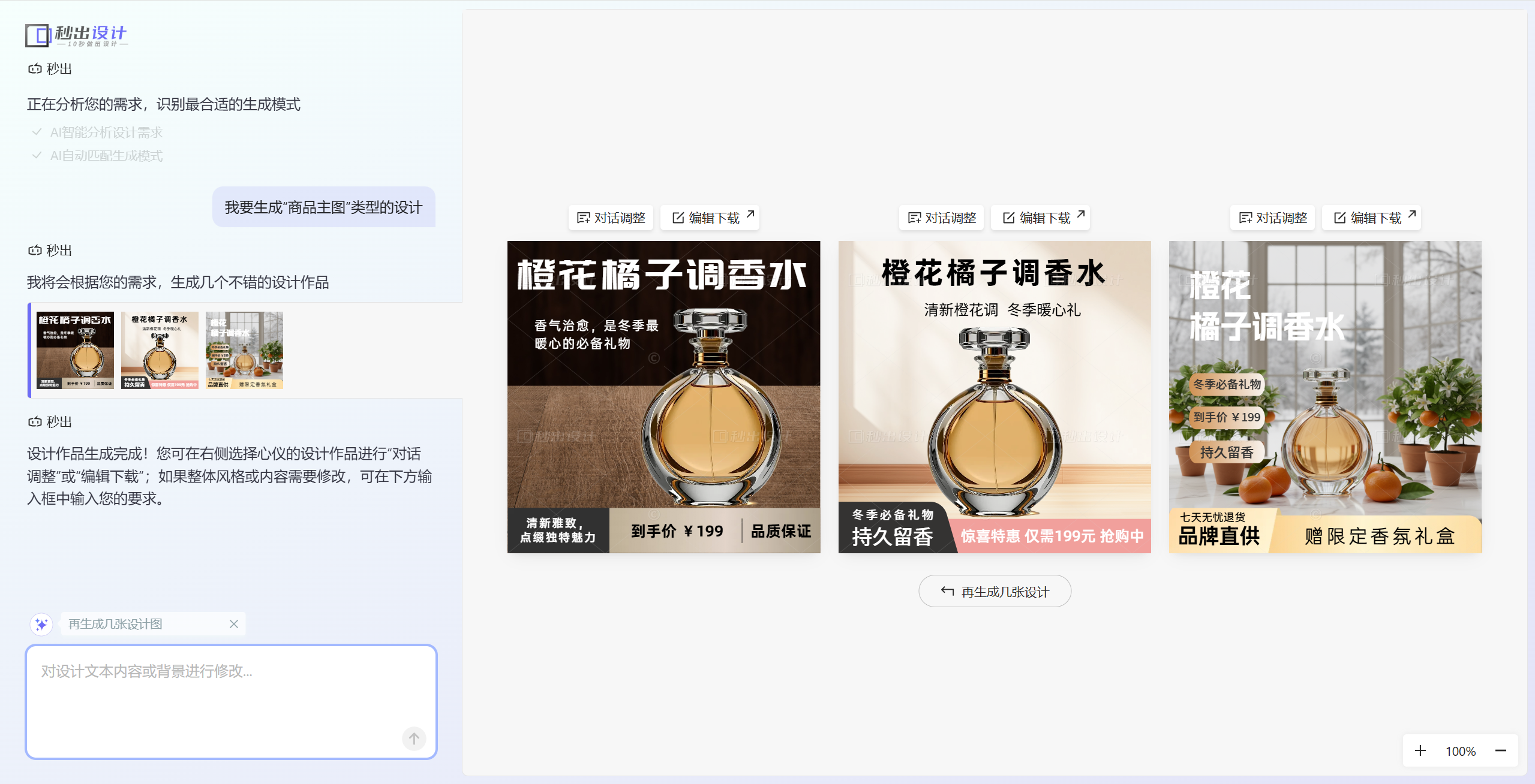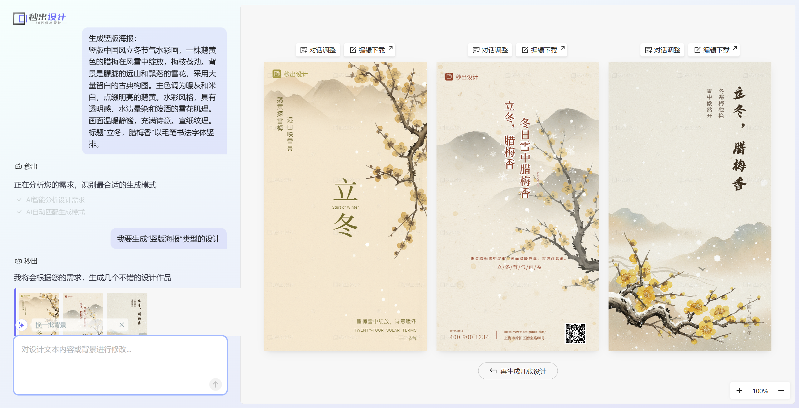 - ai对话调整生成:秒出设计一次性生成3张海报,如果对海报不满意可以点击重新生成;如果对海报细节不满意,可以在左边和ai对话修改海报细节。
