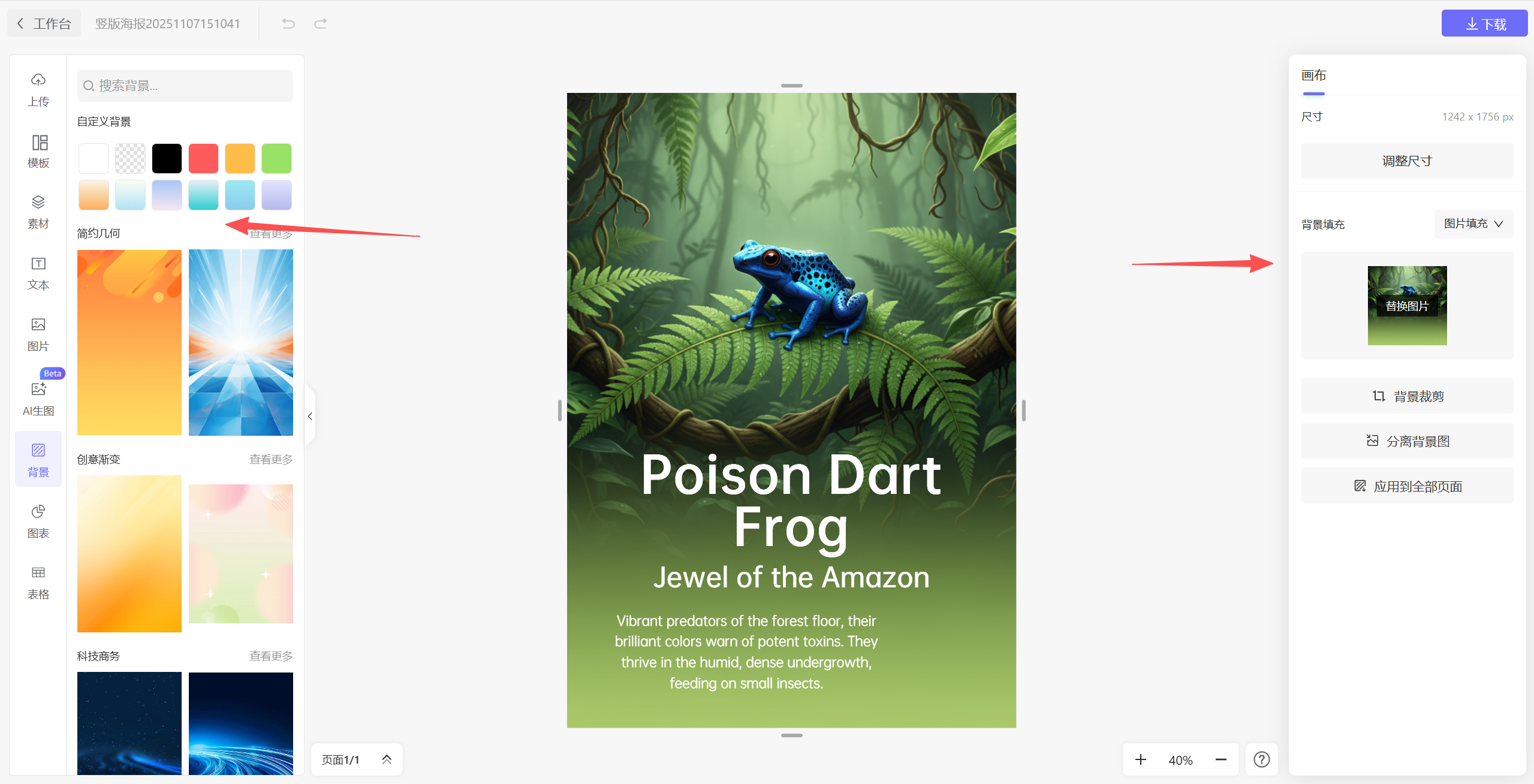 - AI一键生成海报:只需要在首页输入要做的海报主题,ai会一键生成精美海报,生成的海报支持在线修改调整。