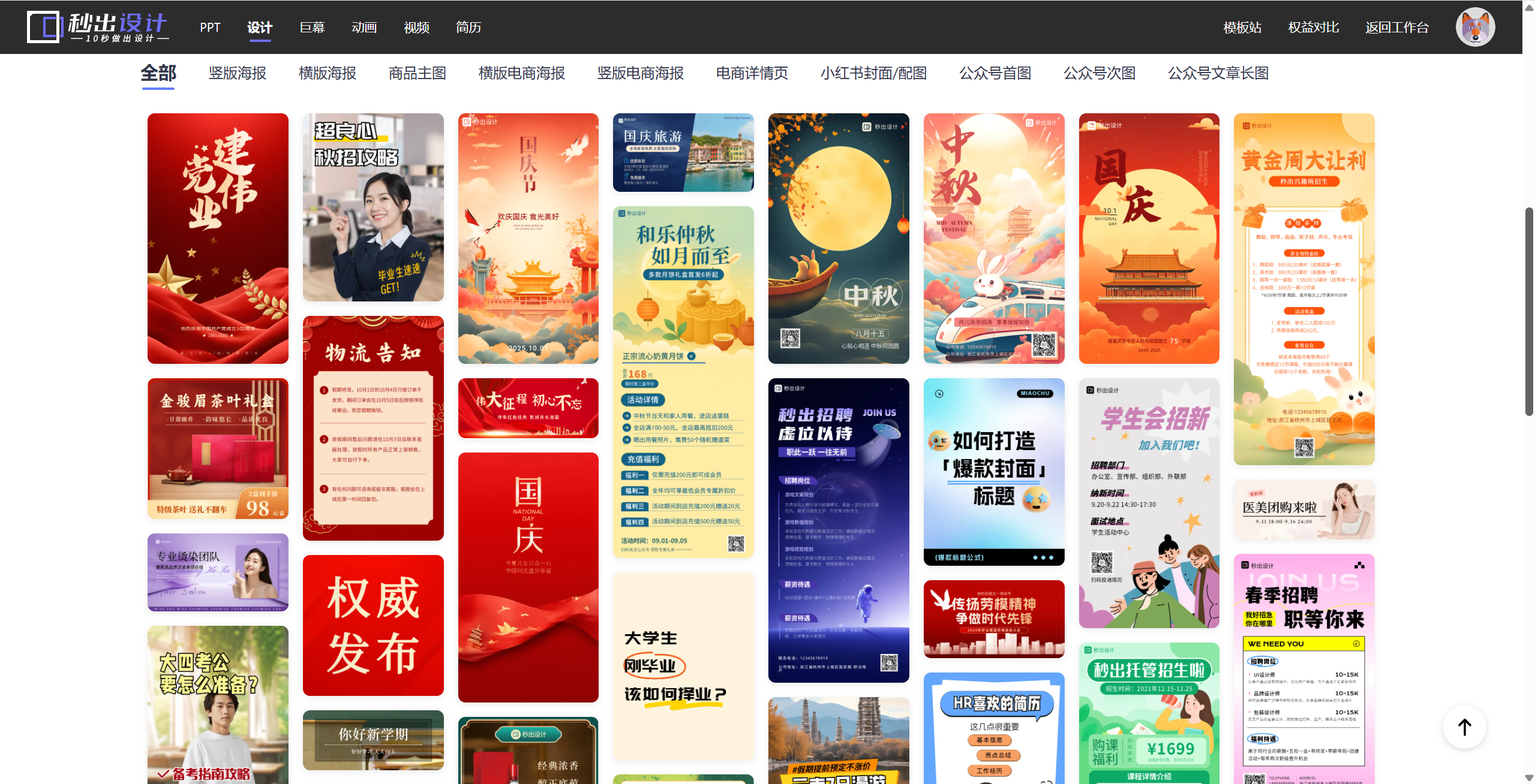 - 海量模板:秒出设计拥有海量精美模板,包括电商、活动、自媒体等等各种场景海报,可任意挑选。
