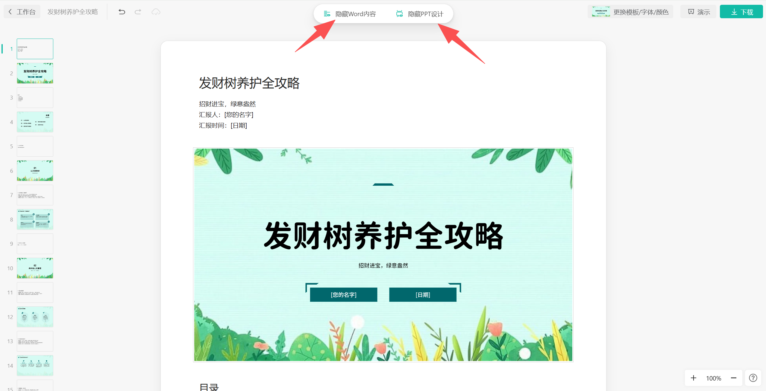 - 纯文本模式。我们直接将ppt预览关掉,在纯文本模式之下,这就是一个word,用户直接按照word的编辑方式使用即可