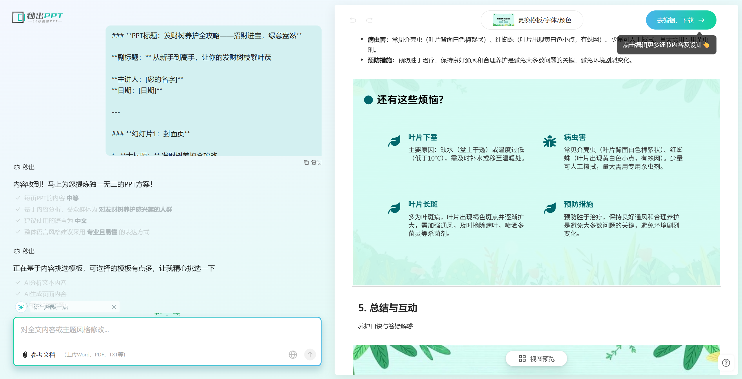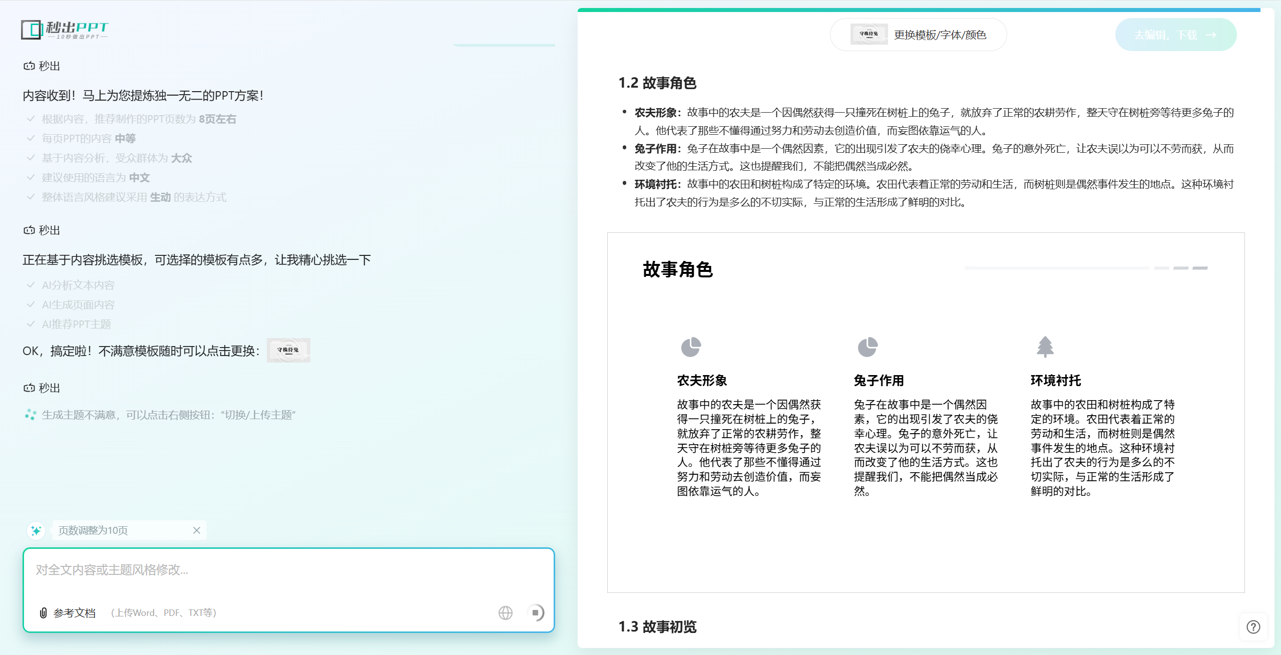 除了一键生成之外,秒出设计还能将你的复杂文本转成一个完整的ppt。