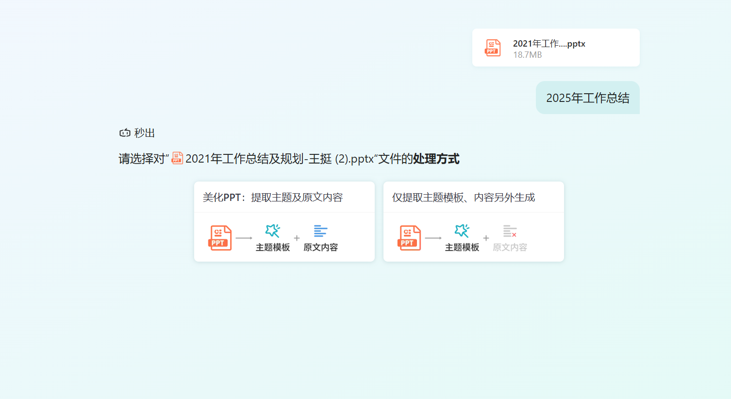 如果我们上传了一个文档,点击生成之后,秒出ppt会询问你是否需要对原文进行优化。如果我们的文档已经很完善了,那么你就选择保持原文,ai会一比一复现文本内容,不修改,只做排版设计。如果是我们的文档需要进一步优化,那么我们就选择智能优化文本,ai会先对文本内容进行优化,再对优化后的内容进行排版设计。
