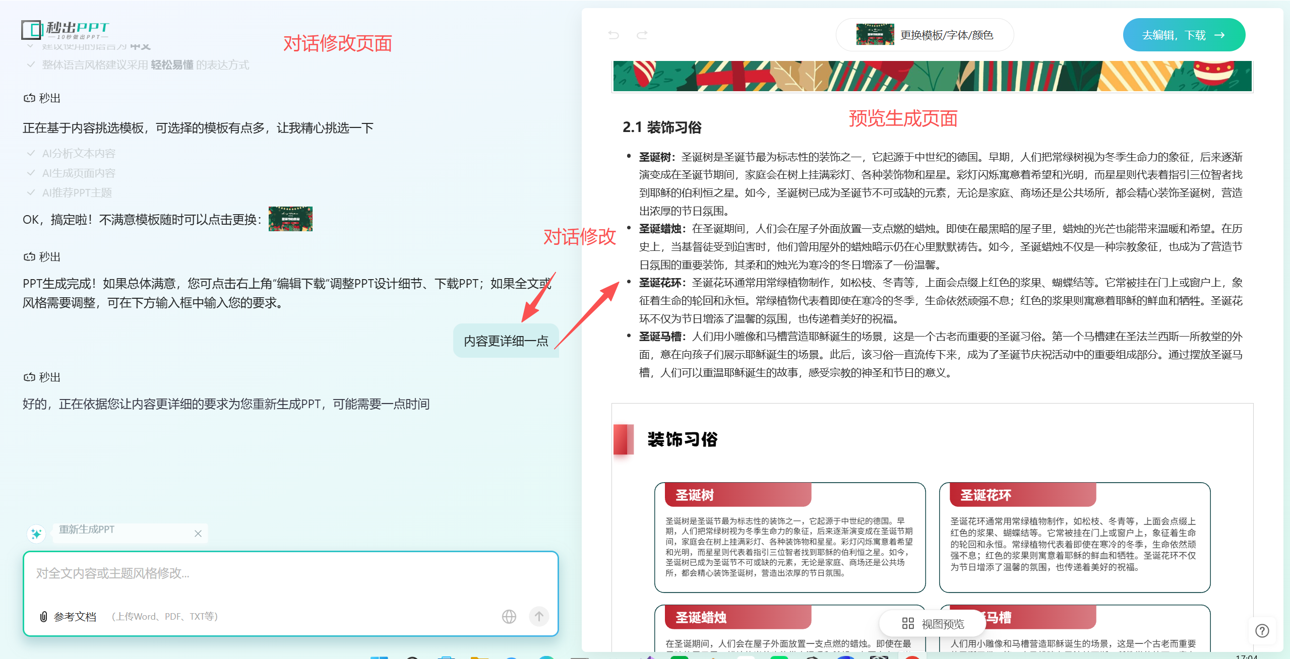 左边是一个和ai对话的界面,我们可以随时随地的暂停生成,然后告诉ai我们更多的ppt要求或者是对当前预览的ppt需要修改的地方,ai都能满足你,它就是一个专属于你的设计师。