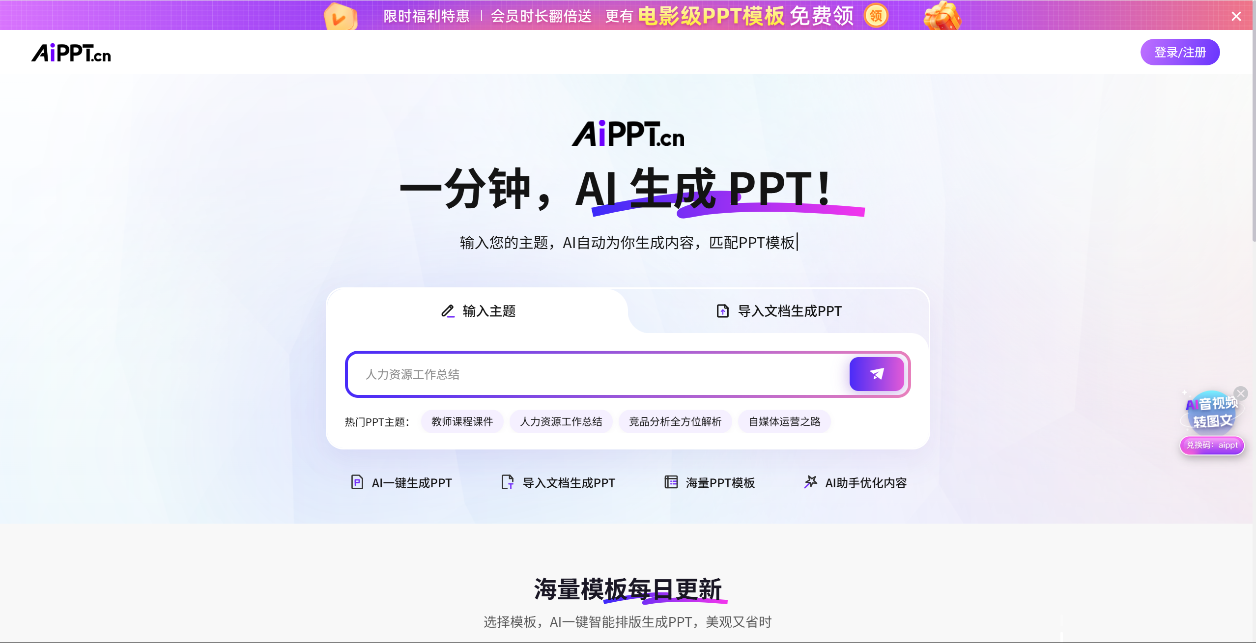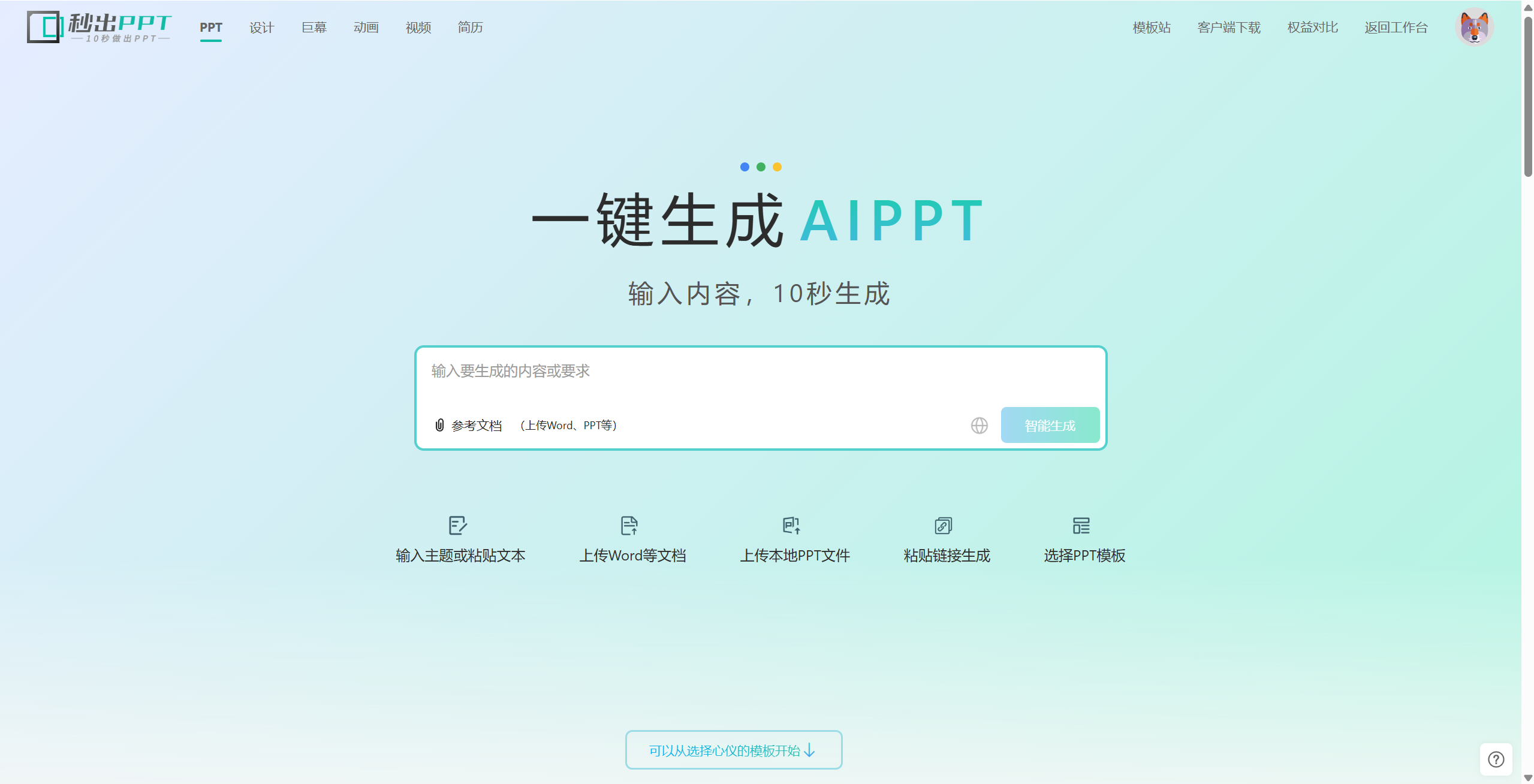 秒出PPT是专注于制作PPT的在线工具,支持一键生成、导入文档生成、美化PPT以及在线编辑ppt,还有海量模板可以选择。