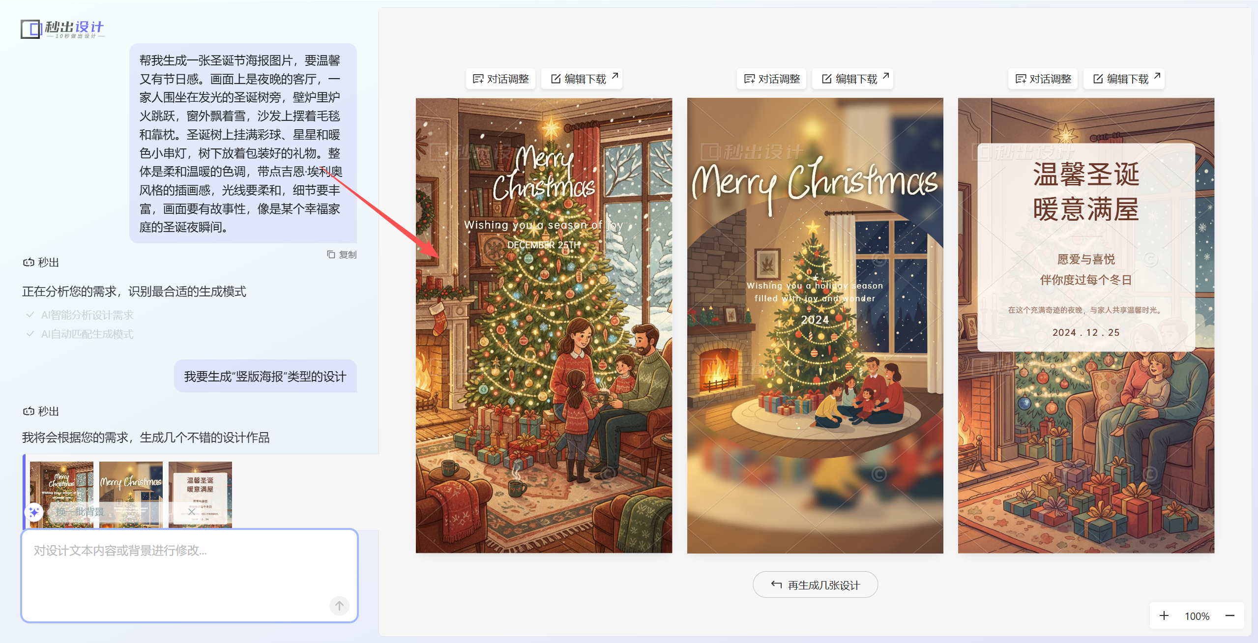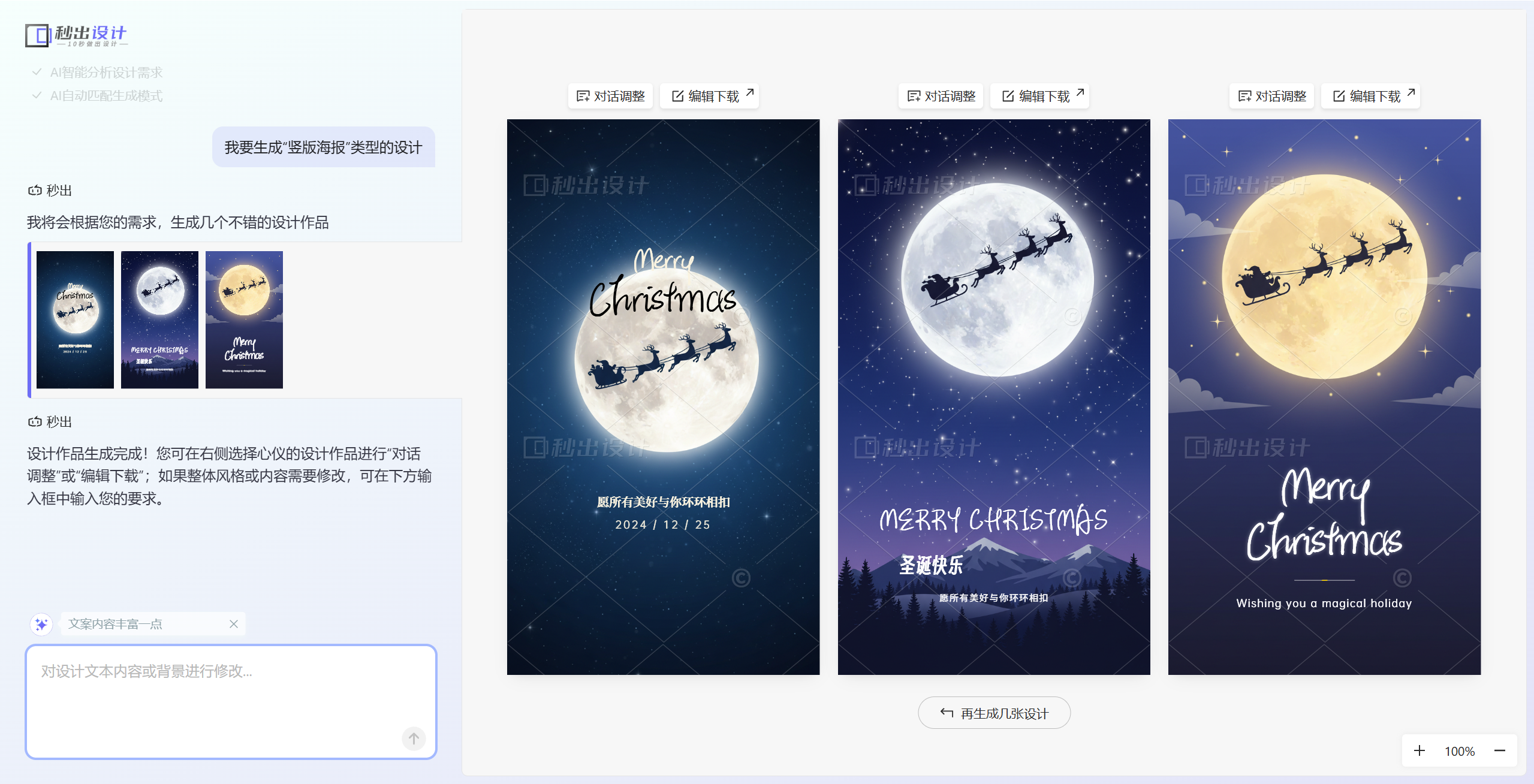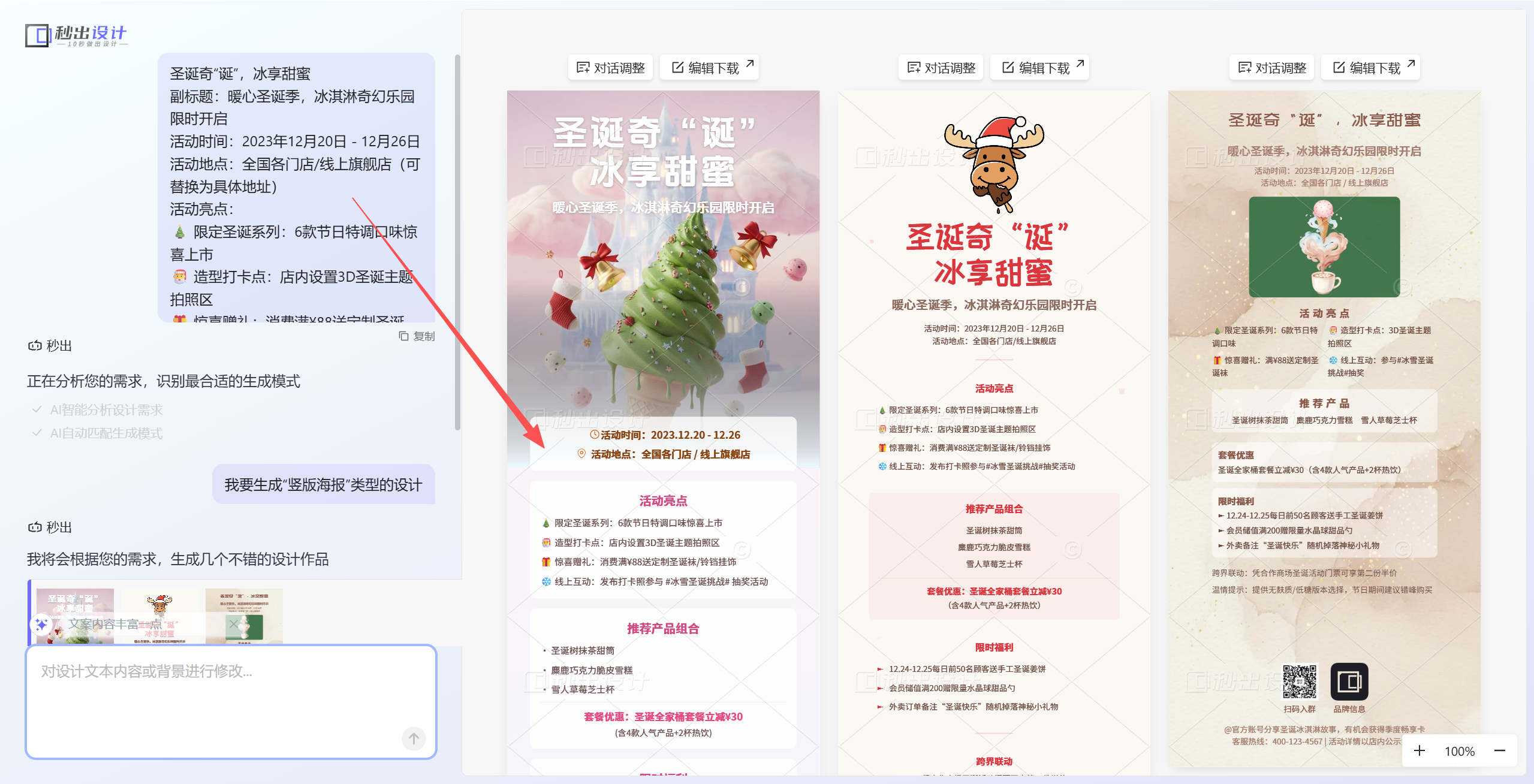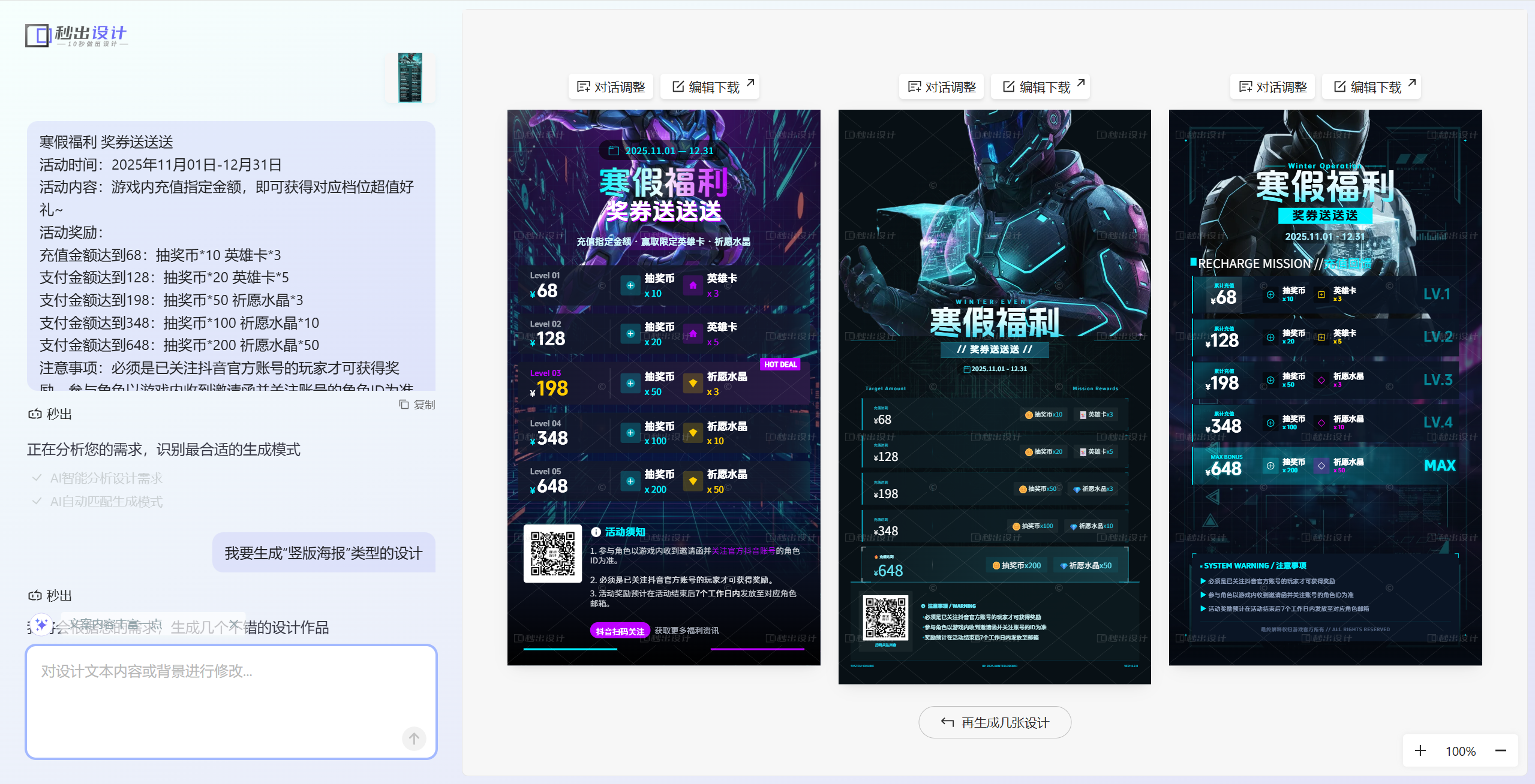 输入简单主题或关键词,AI即可自动生成风格协调、图文搭配完整的海报设计方案。支持多次生成与实时对话调优,用户可自然语言指示修改方向,AI同步响应并调整设计细节,实现真正意义上的“所想即所得”。