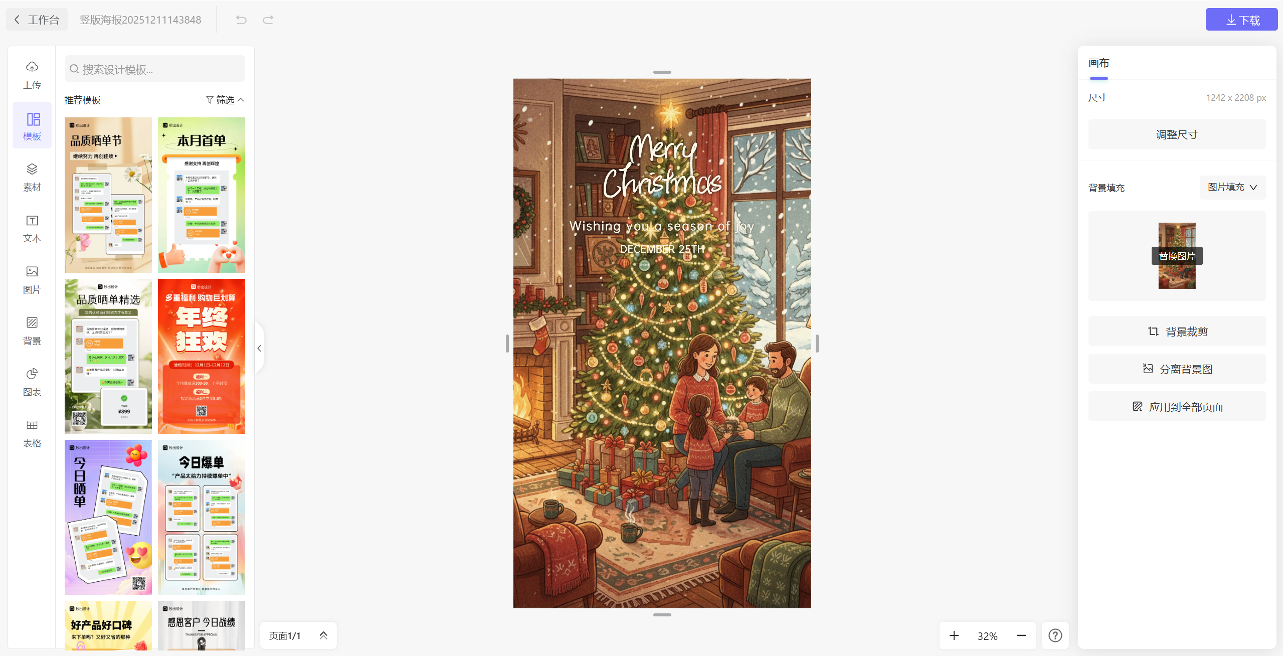 提供完整的在线编辑能力,包括文字、素材的修改与替换。内置AI素材生成器,可即时生成所需视觉元素。更搭载局部重绘功能,用户仅需涂抹需要修改的区域并描述需求,AI即可针对该区域进行智能重绘,其余部分保持不变,实现精准、高效的画面调整。