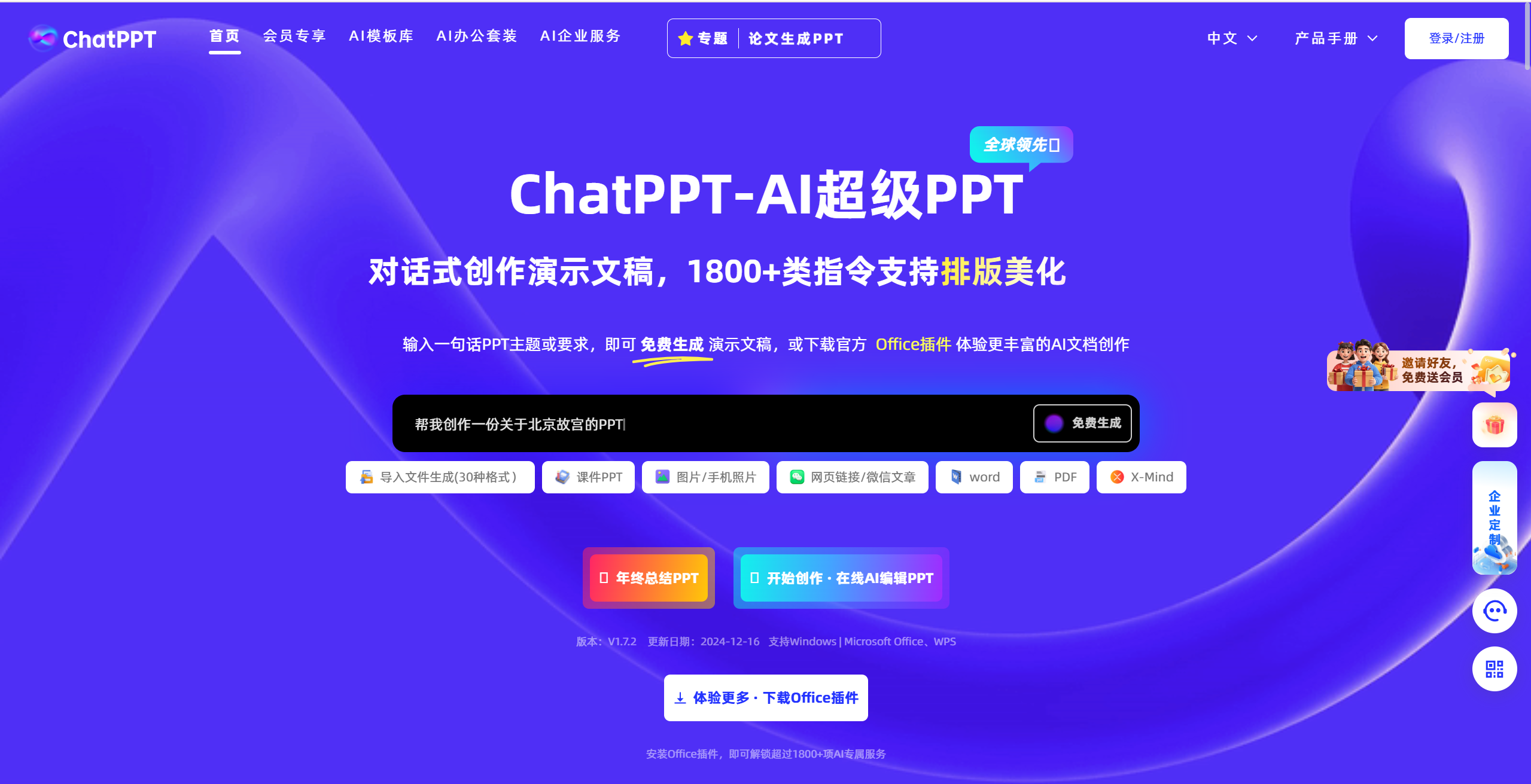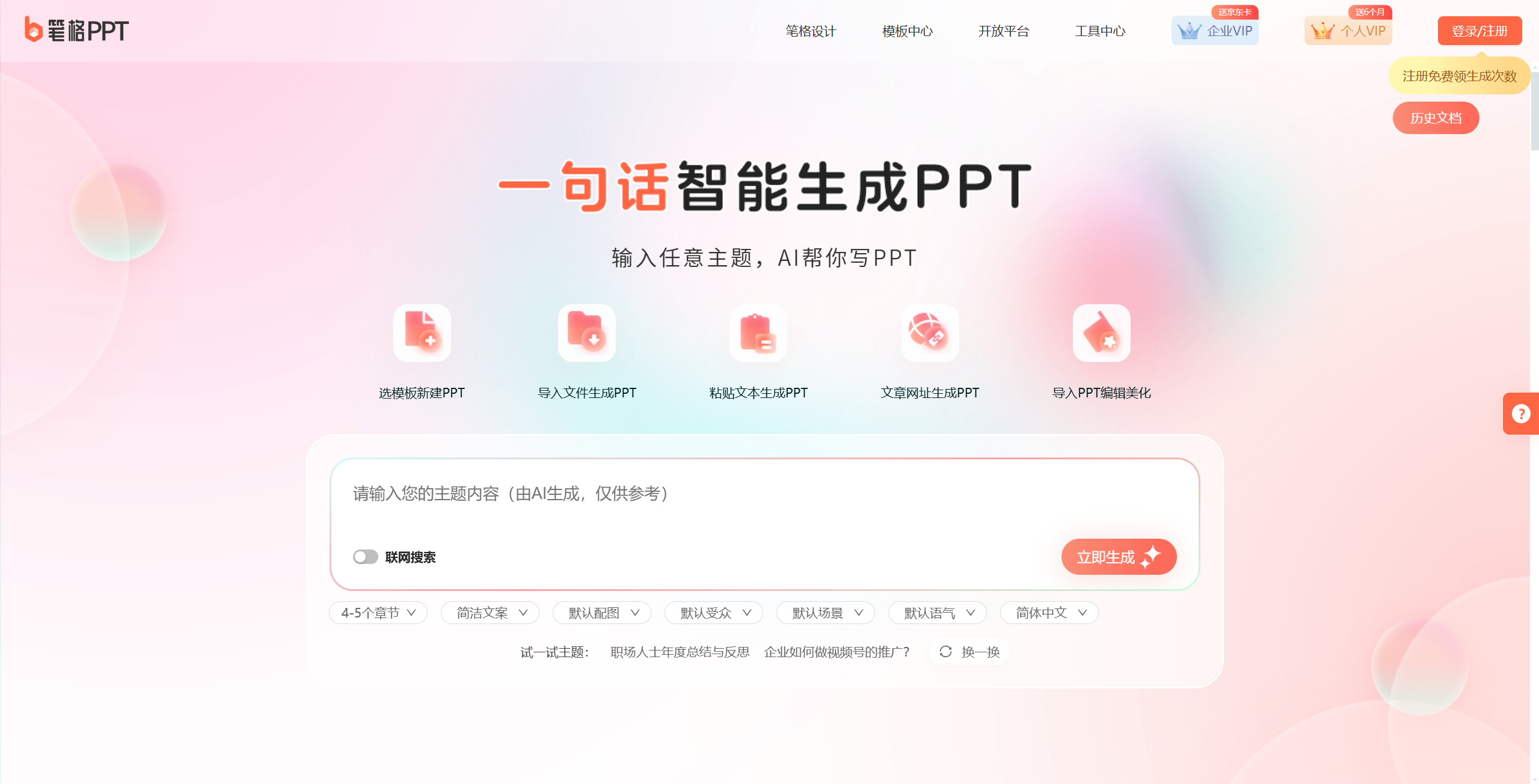 秒出PPT是最开始做ai ppt的网站之一,一直潜心将这一块做到最好。支持用户一键生成PPT,还支持导入文档生成或者是自由输入生成。
