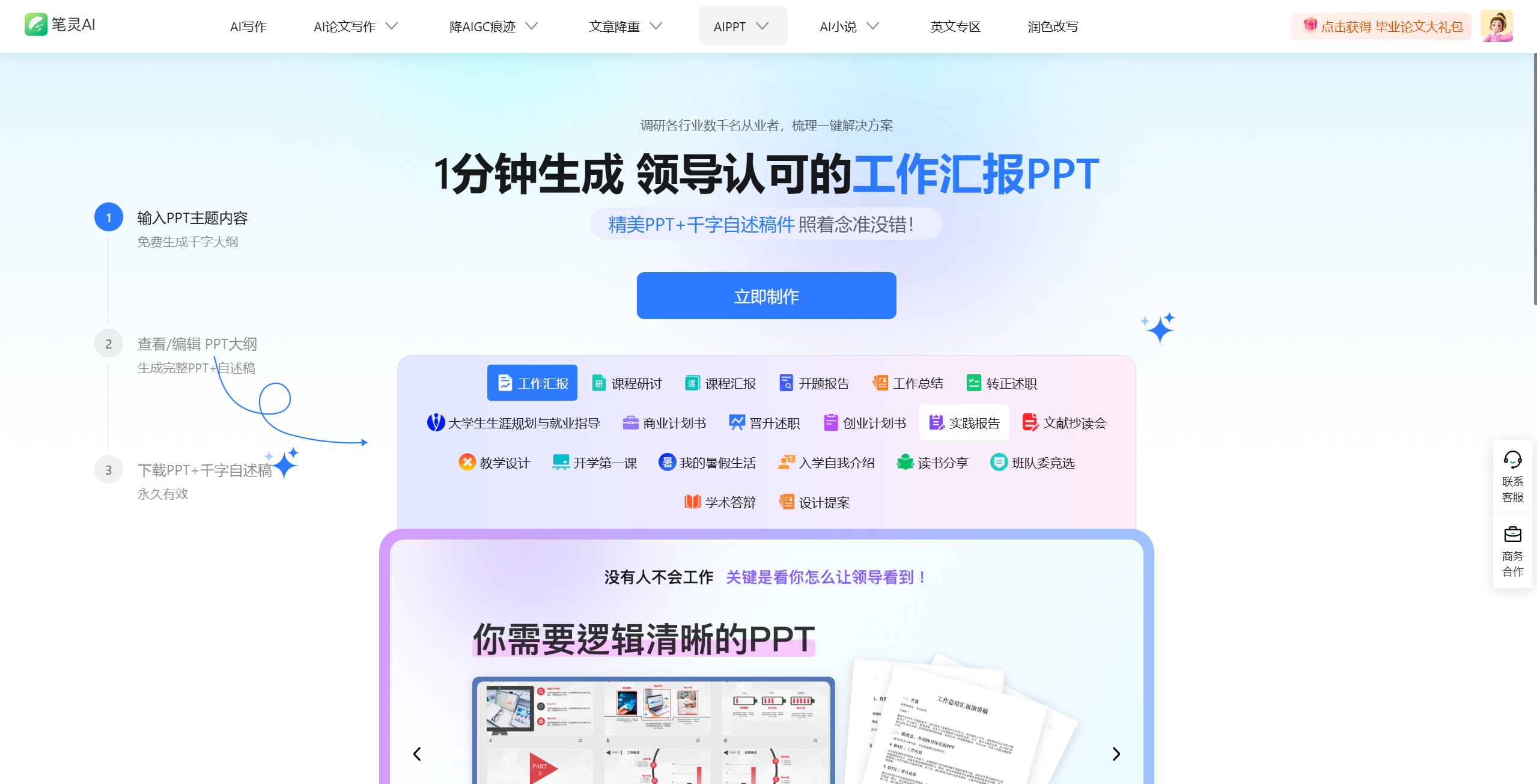 笔灵PPT专注于学术领域,支持快速生成毕业论文、毕业设计和答辩PPT,适合学生用户。
