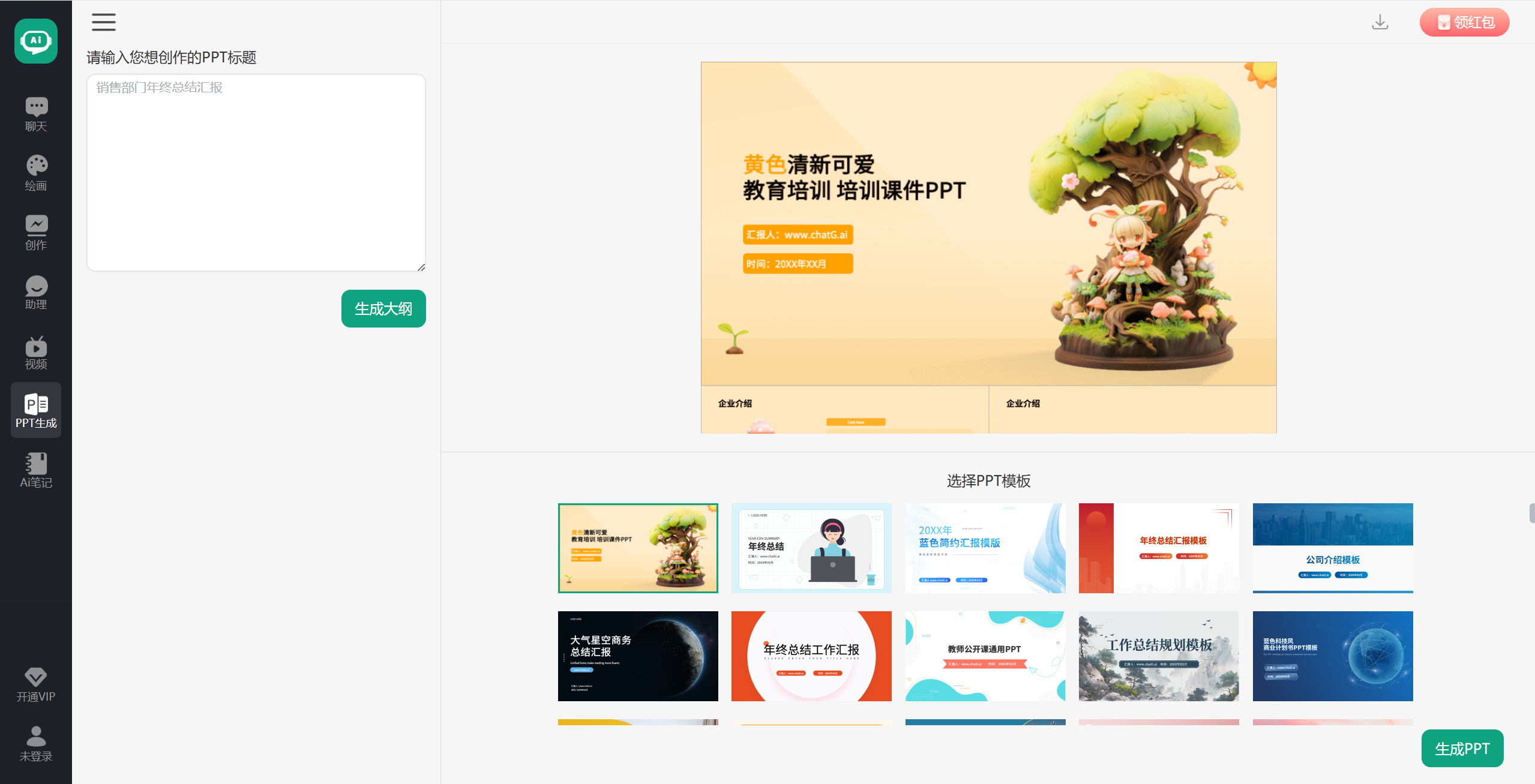 ChatPPT的风格与国外知名工具Gamma类似,支持一键生成PPT。用户可以在生成过程中选择AI生成图片或从图库中挑选素材,但每一步都可能涉及付费选项。