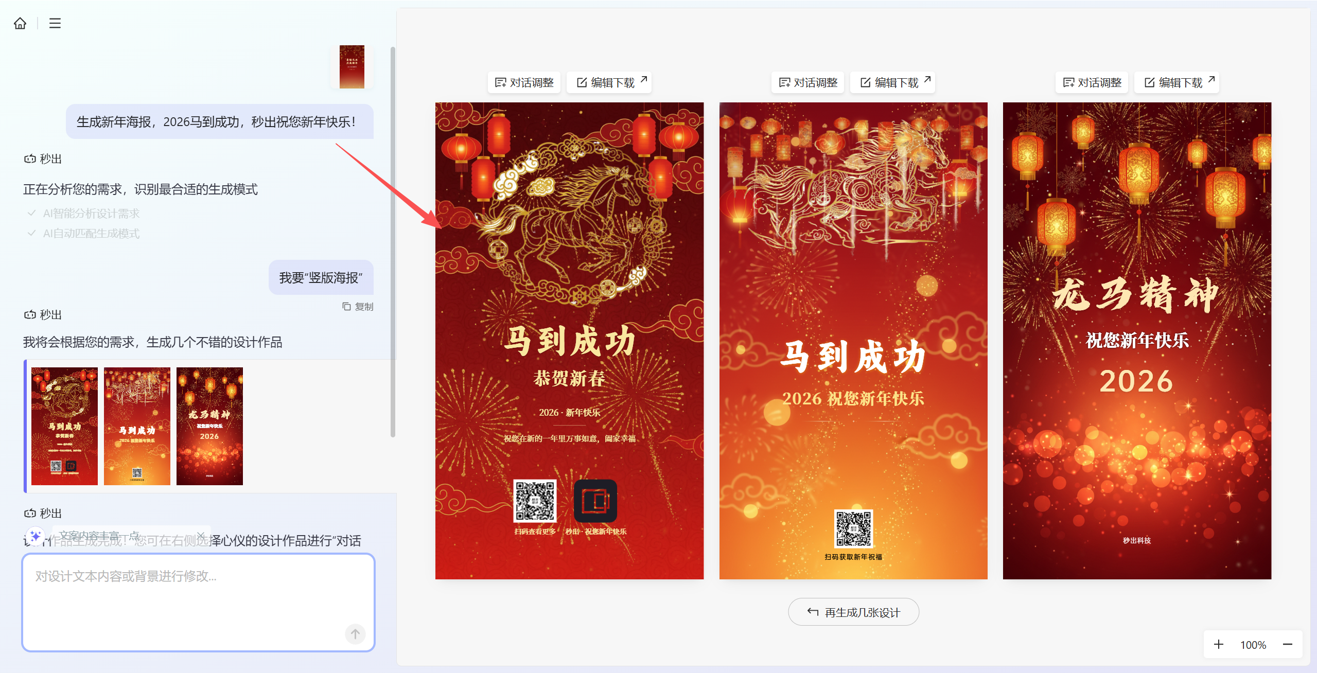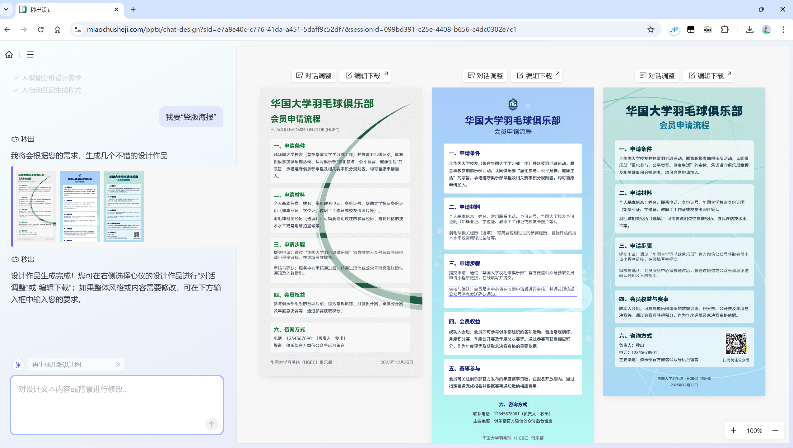 秒出设计一次性生成三张不同的海报,并且生成页面也极具特色,分为了左右两屏。右边是生成的海报预览页面,在这里,我们可以看到当前生成出来的海报是什么样子;左边是ai对话页面,如果我们对当前生成的海报不满意,那么可以对话修改。