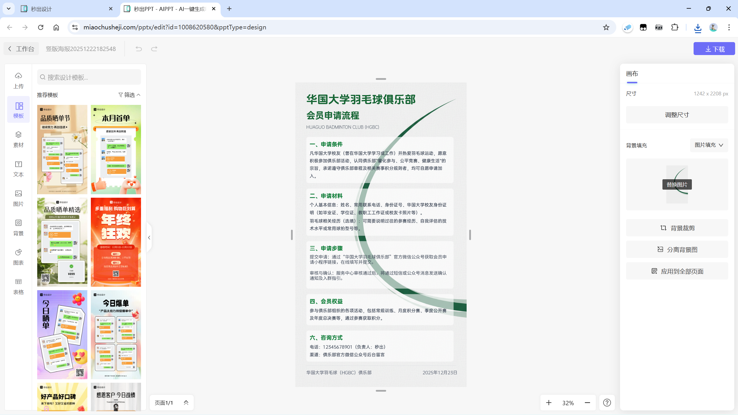 秒出设计生成的海报都是可以在线编辑的,我们在对话修改完成满意之后可以进入编辑页面。秒出设计的编辑页面并不是专业的ps,因为我们生成的图片优先做了图文分离,所以我们可以直接挪动删除或者增加文字、素材等,背景也支持修改。