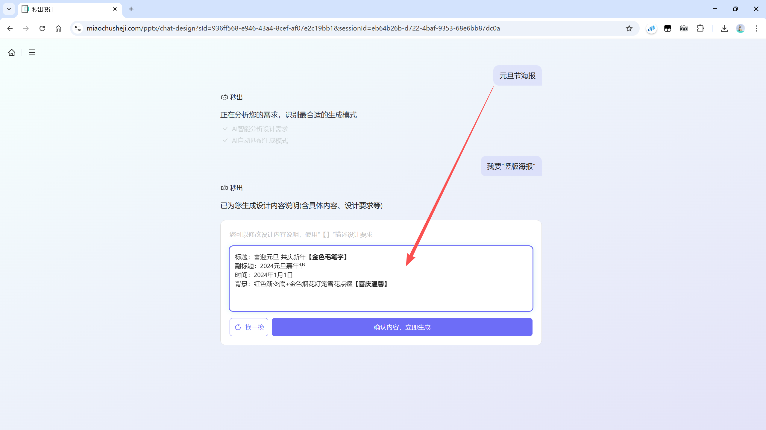 秒出设计支持用户一键生成海报。用户只需要输入一句话或者是要做的海报主题即可生成海报,但是这里秒出设计又有一个创新点。秒出设计会根据你输入的模糊的语句生成一个“说明书”,说明书里是对于当前海报的一个提示词,这个提示词是ai写的,你可以修改。