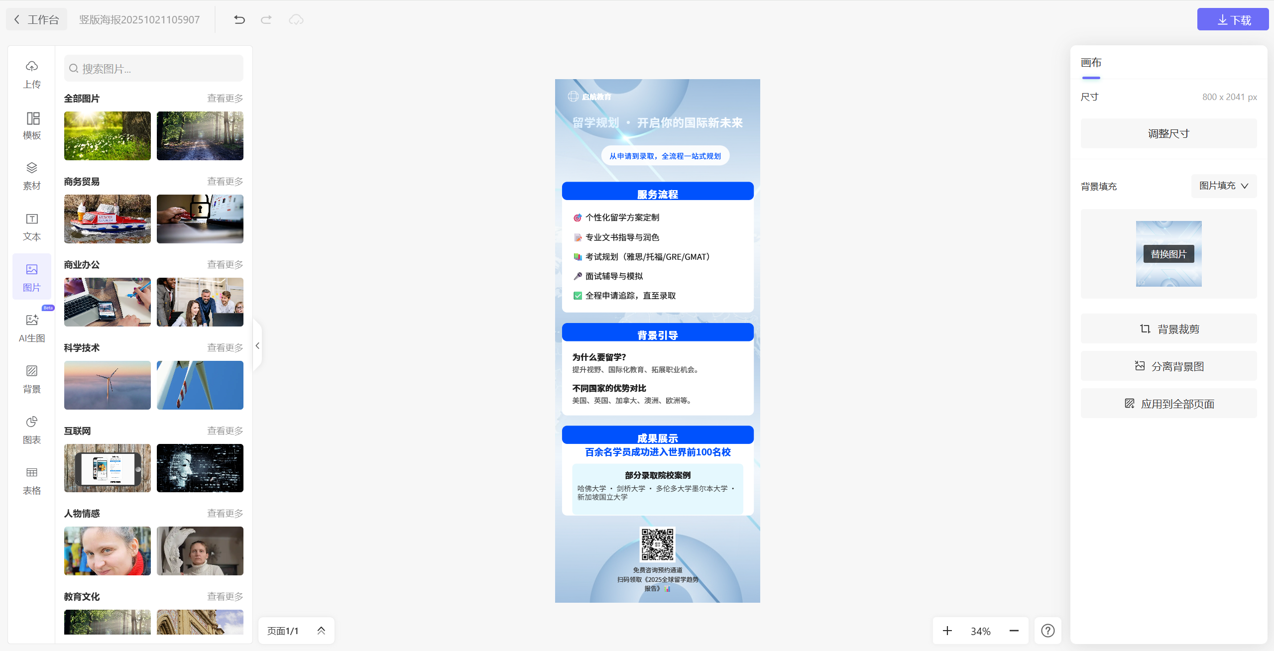 最后就是秒出设计是可以在线编辑的,我们选择其中一张海报之后可以在线对海报进行修改调整。秒出设计提供简单的工具,小白也可以马上上手。另外,还有ai辅助编辑,可以只能生图、元素等等,让海报个性化!