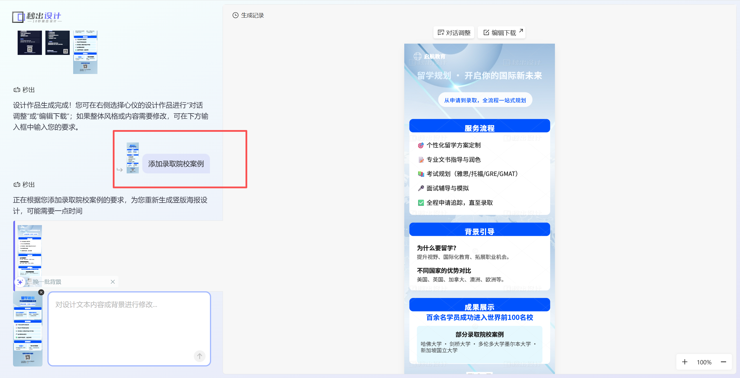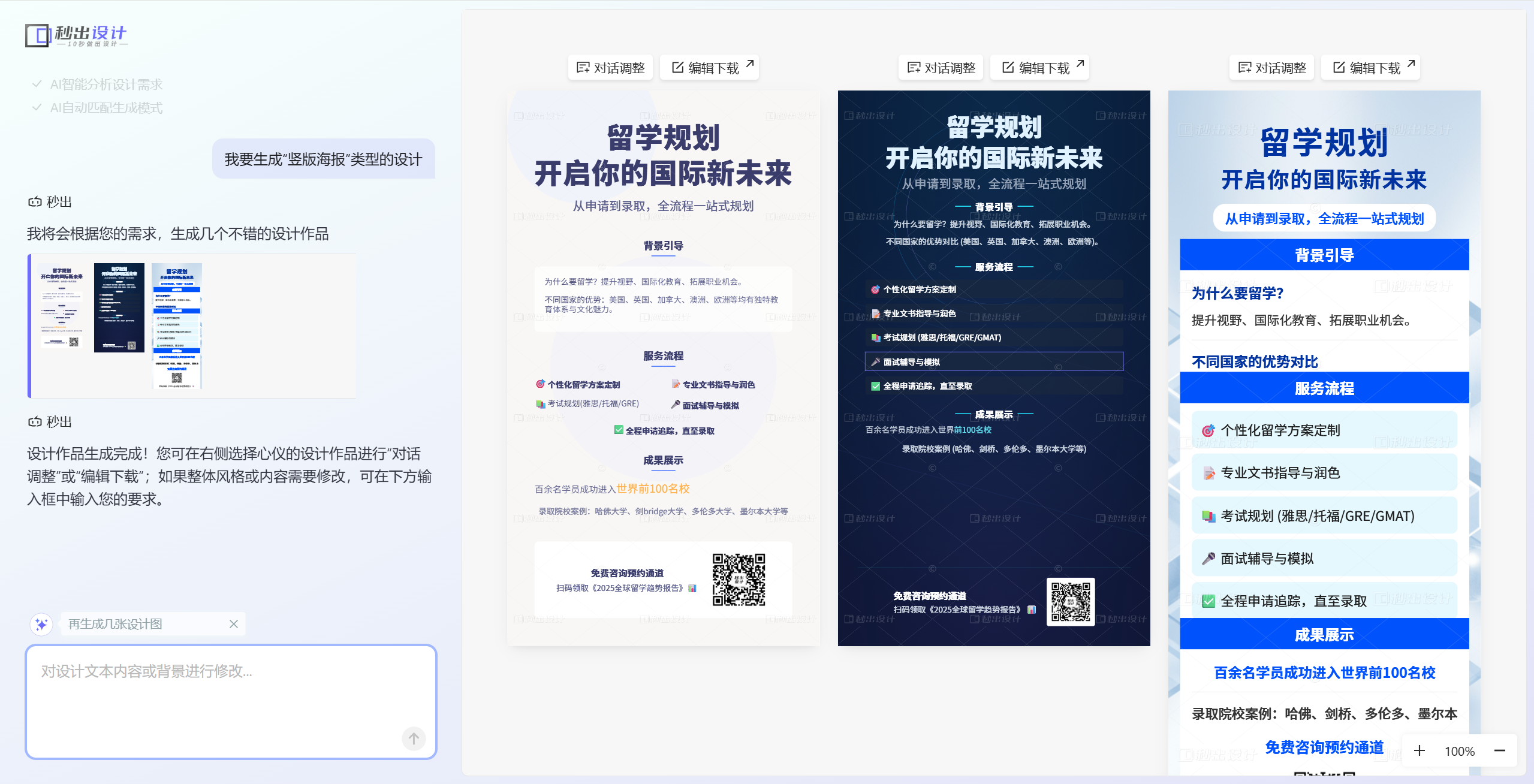 生成的海报都是可以修改的。秒出设计的生成页面分为了左右两边,左边是和ai对话的页面,如果对生成的海报不满意可以和ai对话修改;右边是海报预览窗口,你可以看到当前海报是什么样子的,还可以选中其中一张进行单个修改。
