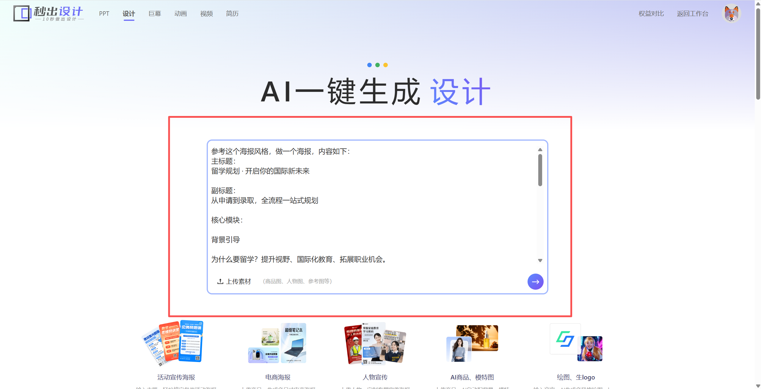 秒出设计支持一键生成海报,你只需要上传你的素材图片、logo等等,然后写你要生成什么海报(或者是准备好的文案),点击生成即可。