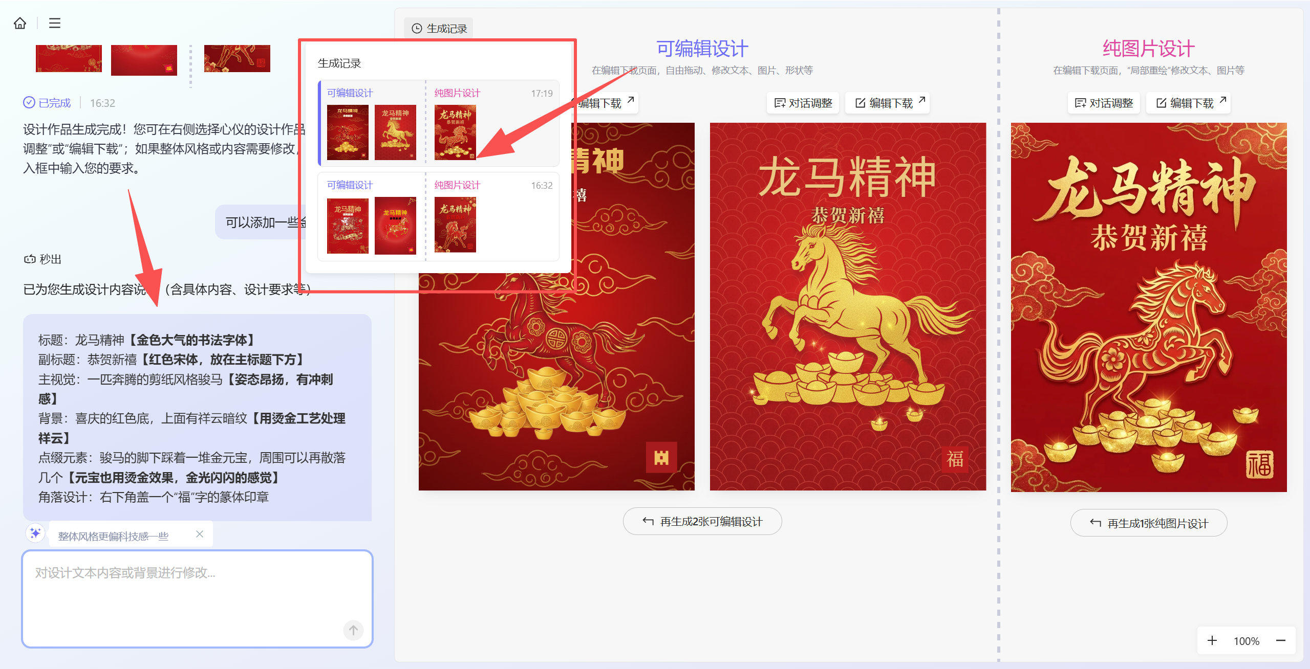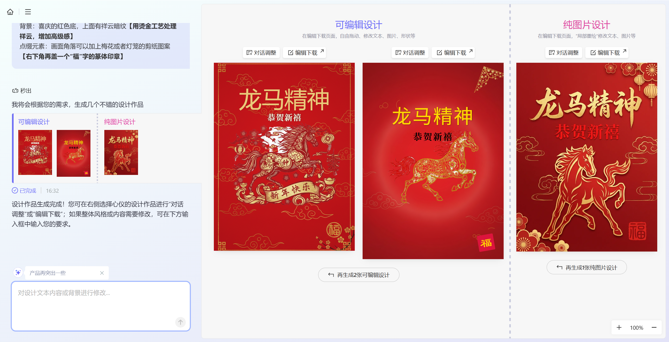 秒出设计单次生成三张不同的海报,其中两张为可编辑海报,这一种是AI根据要求一部分一部分画出来的海报;另外一张是纯图海报,这是由nano banana(纳米香蕉)模型直接生成的海报,通过秒出设计对AI提示词的优化,让模型生成的海报更符合我们的需求。
