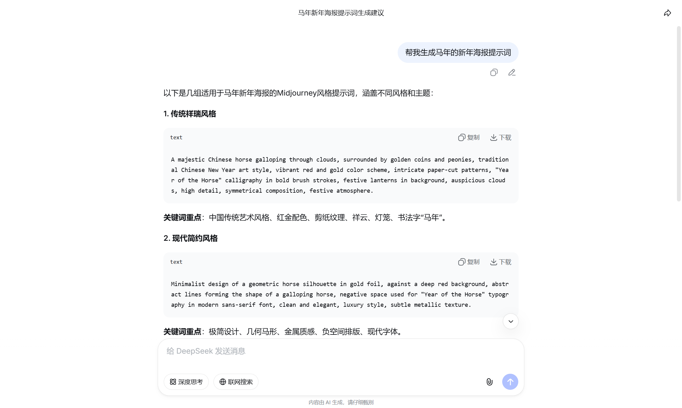 1、打开Deepseek,告诉它我们需要的海报,AI会返回给我们好几种不同的AI提示词。