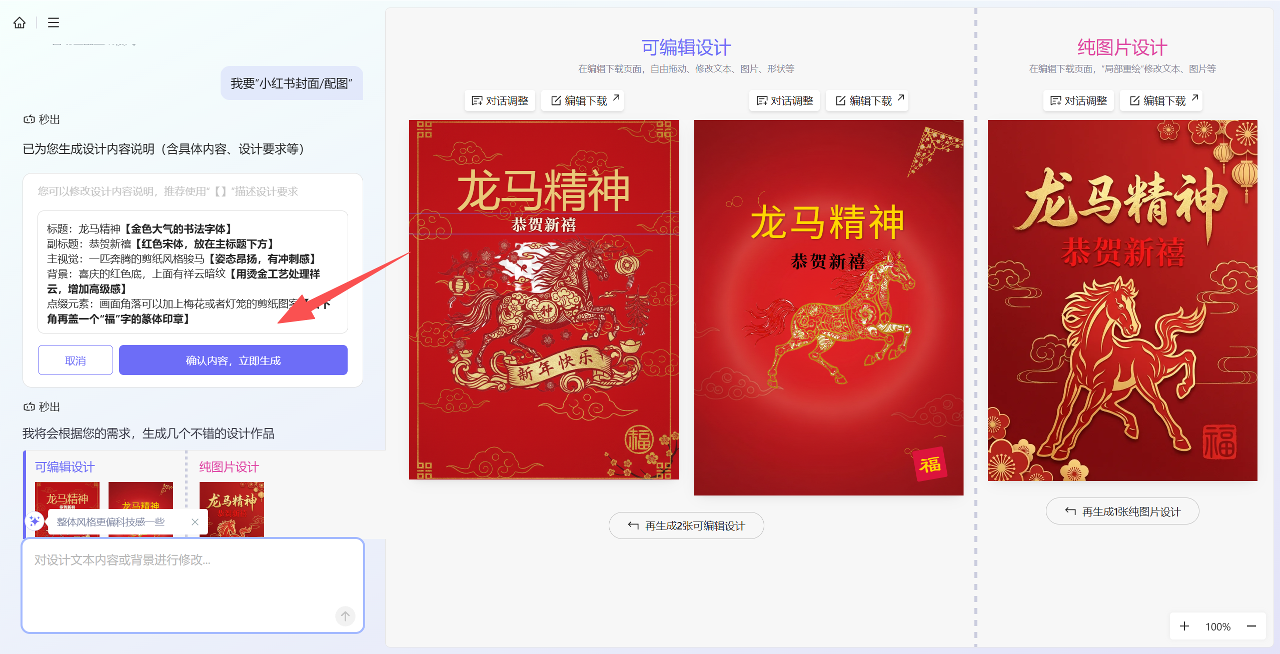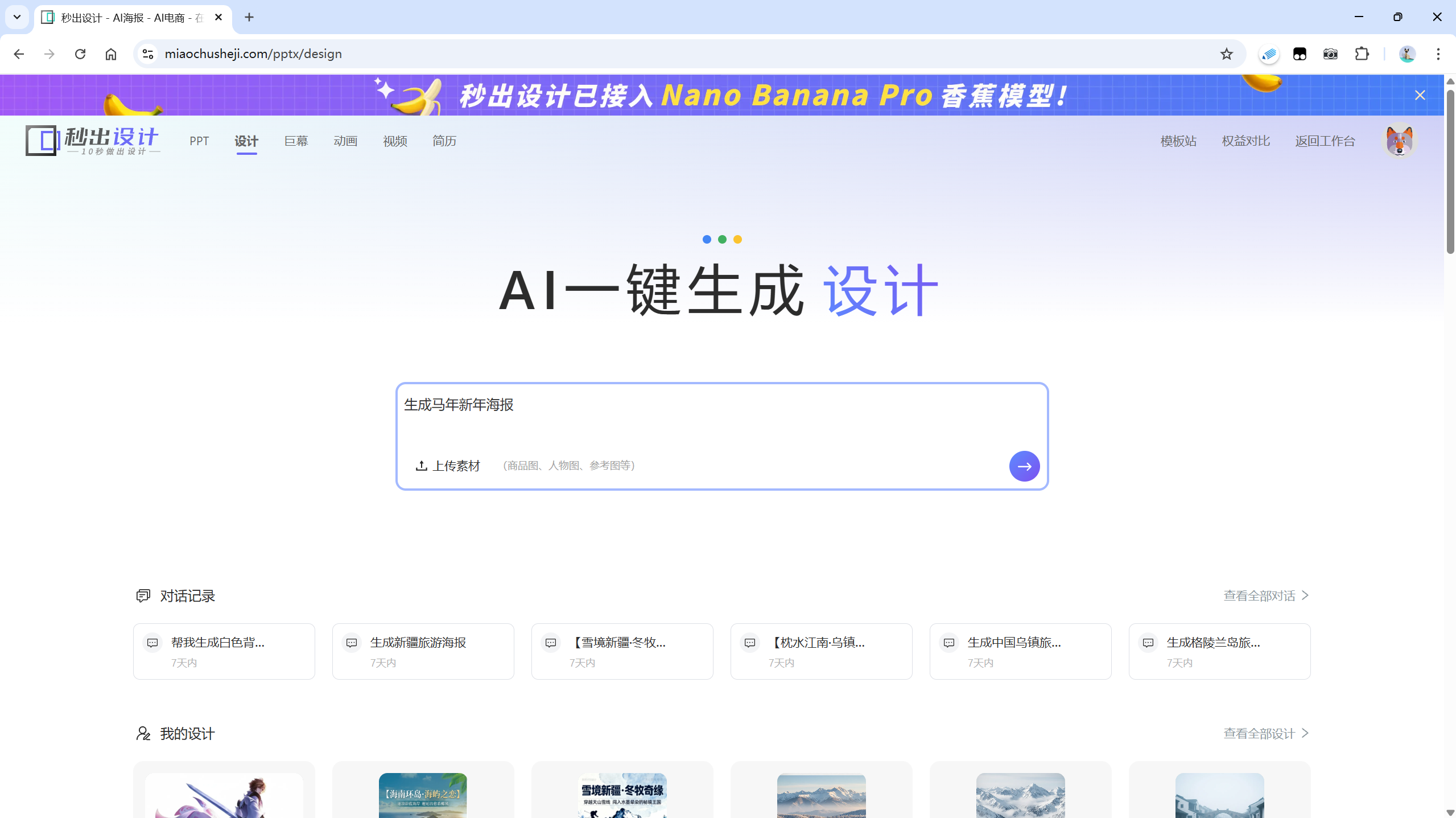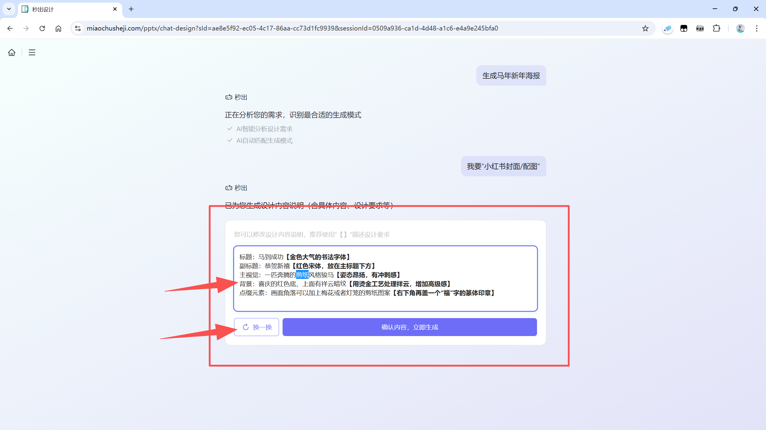 当我们不太确定自己要什么样子的海报的时候,我们可以直接在秒出设计的输入框里面输入我们大概的一个主题和想法。例如,这里我直接输入的是“生成马年新年海报”。