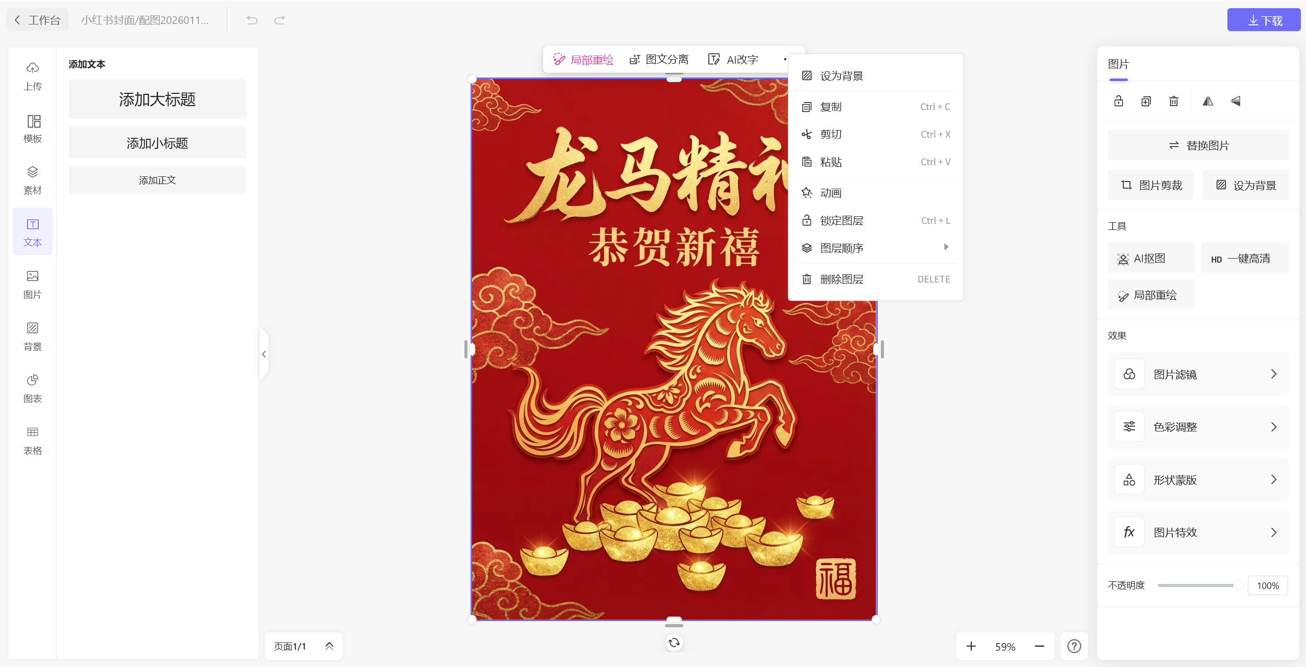 而这两种不同的海报都能够在线编辑。可编辑海报支持直接编辑,由于这是AI一部分一部分画出来的海报,所以每一个部分都是可以直接编辑的,删除、增加或者修改都行。还有AI生图,辅助我们编辑海报。