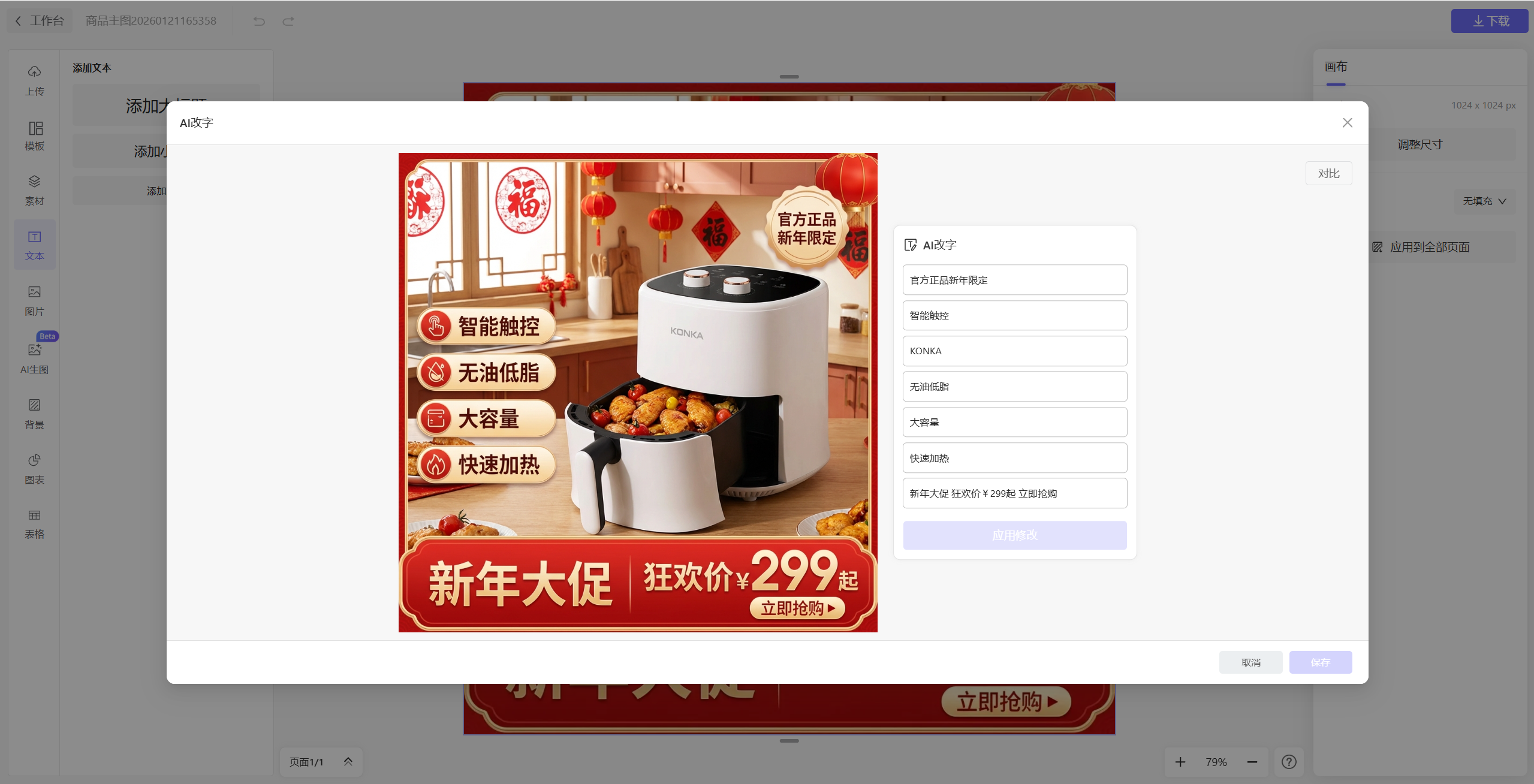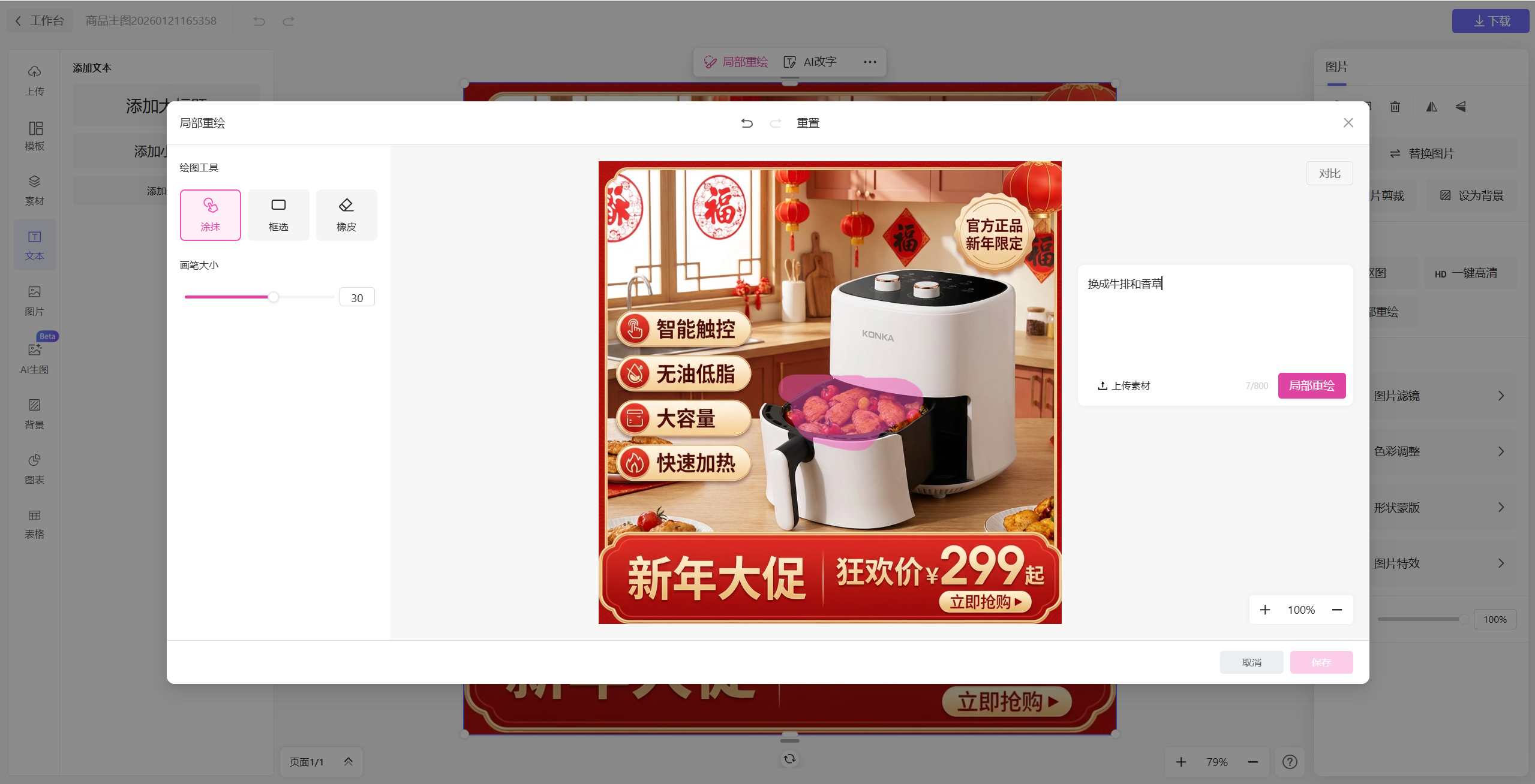 纯图海报支持的编辑修改方式是涂抹修改和文字修改。如果我们对图中某一部分不满意,那么可以直接涂抹那一部分,输入我们的要求,让AI修改那一部分。