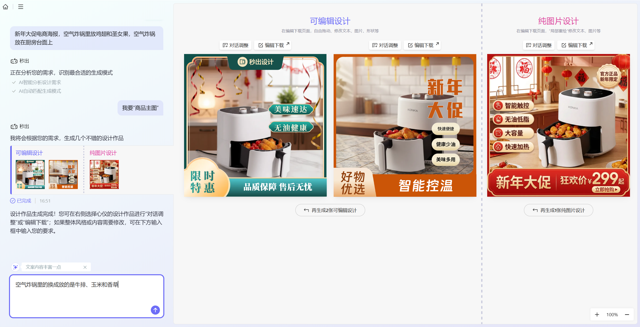 生成之后的海报分为了2张可编辑海报和1张纯图海报。如果不满意我们可以重新生成或者对话修改。重新生成和对话修改可以选择其中一张或者一起修改。