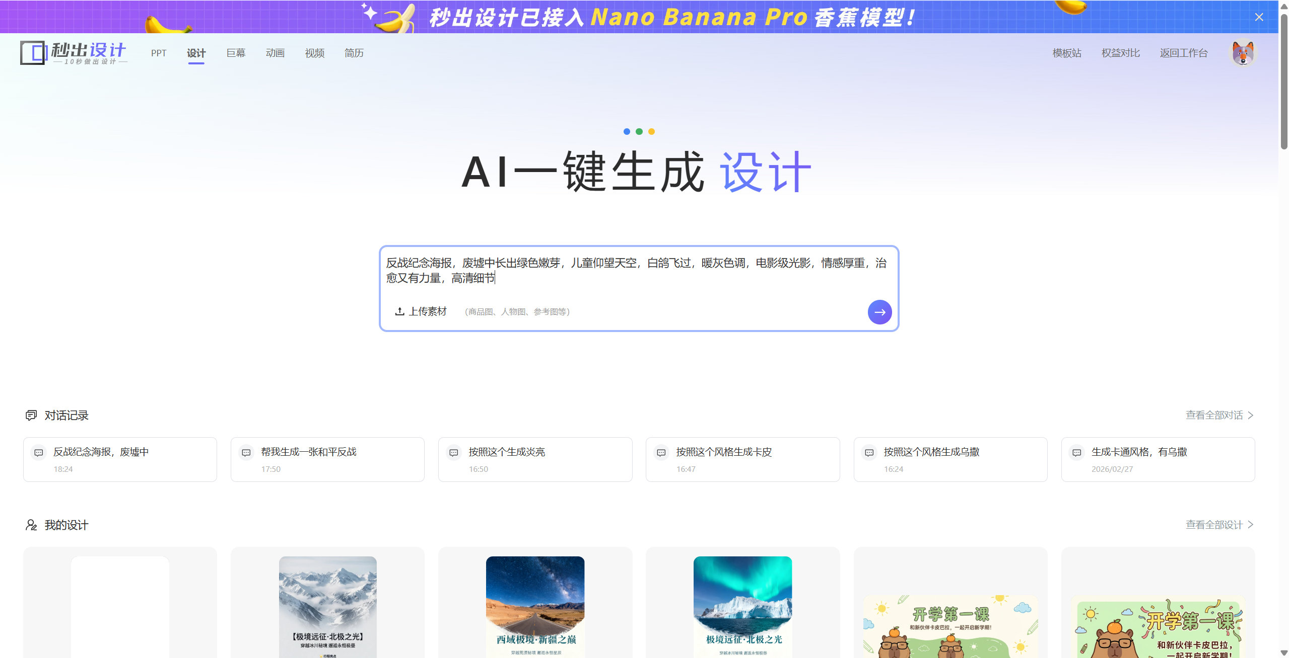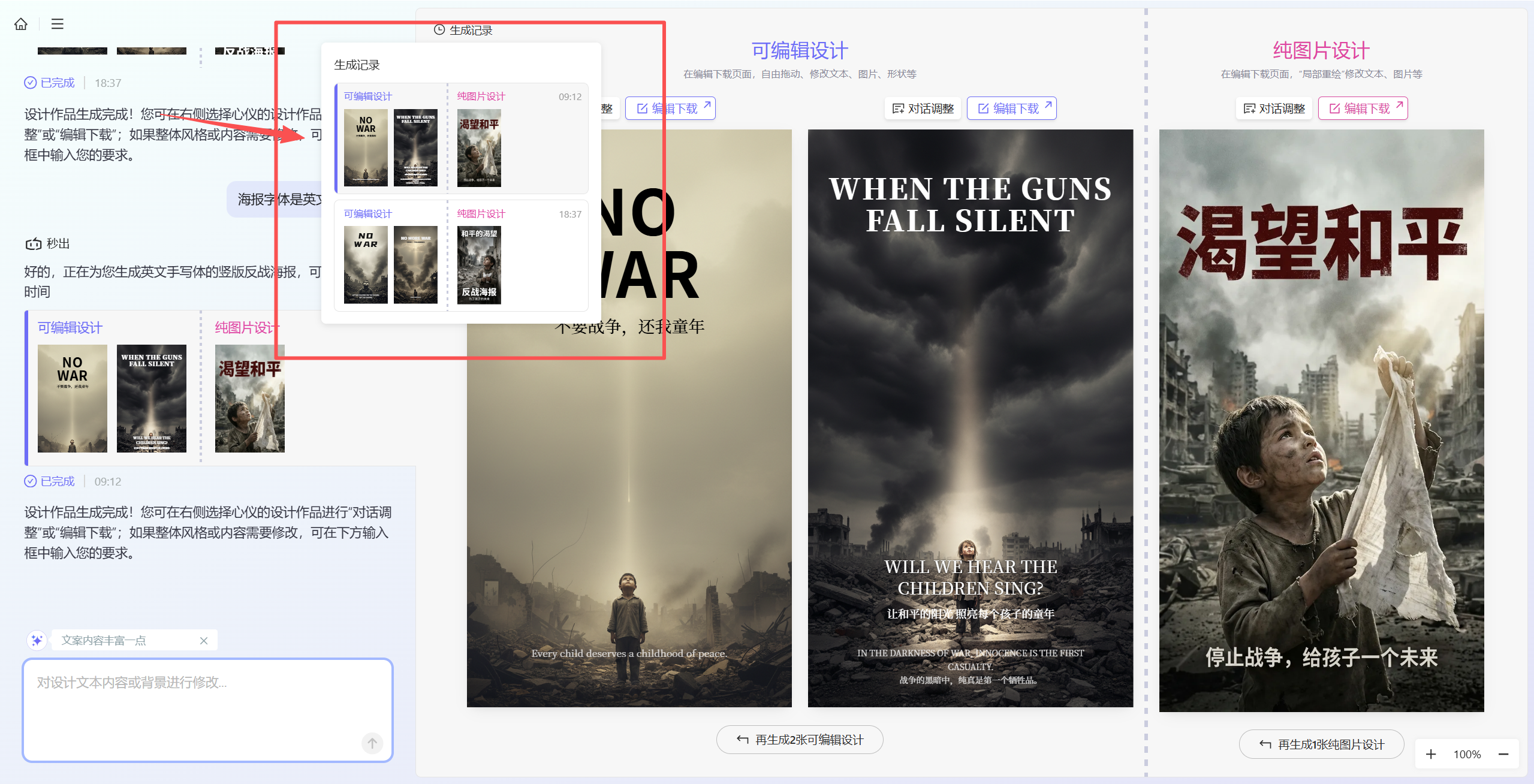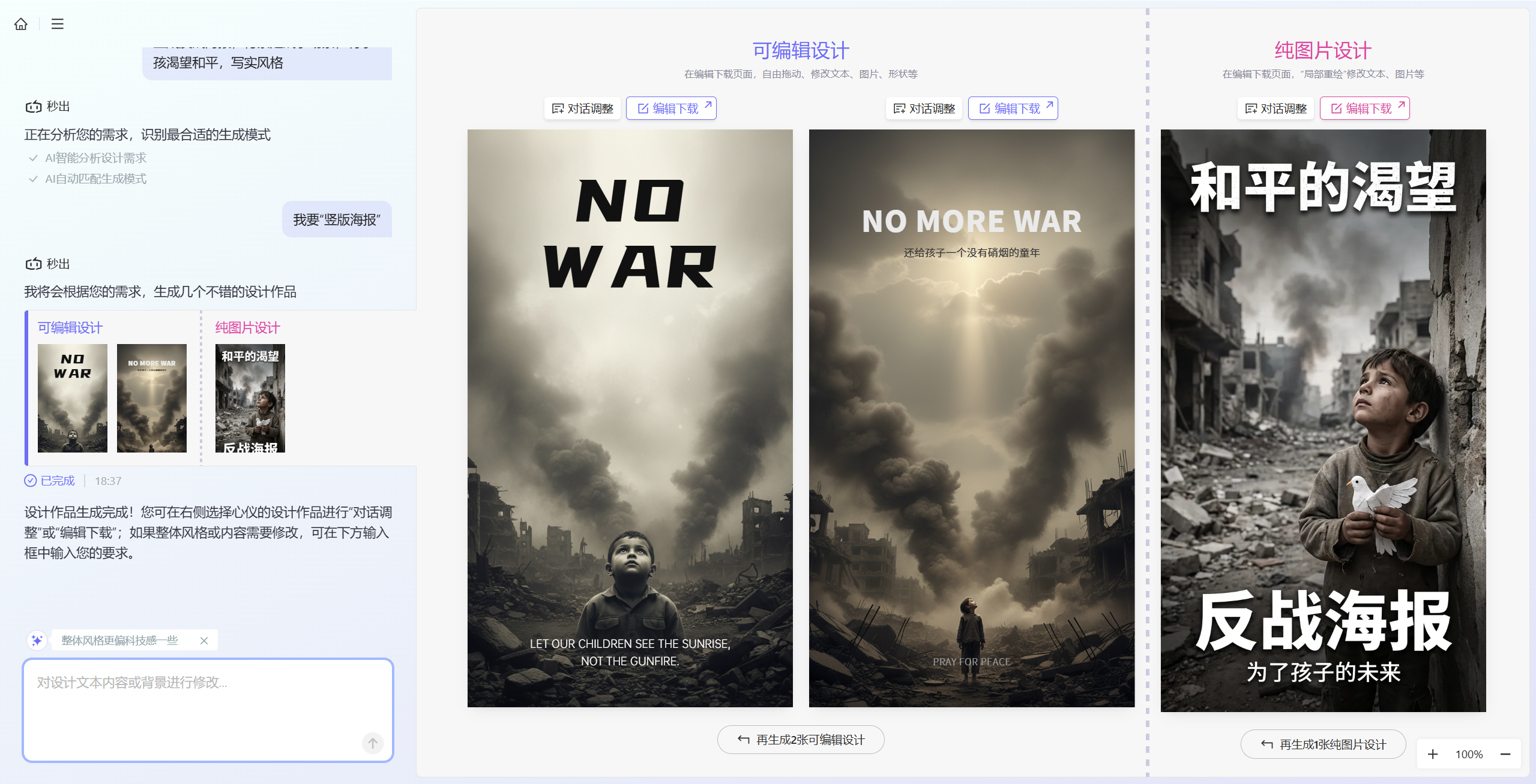 我们只用在秒出设计首页输入我们要做的主题,这里我直接写主题“生成反战海报,背景是战争场景,有小孩渴望和平,写实风格”,然后点击生成。