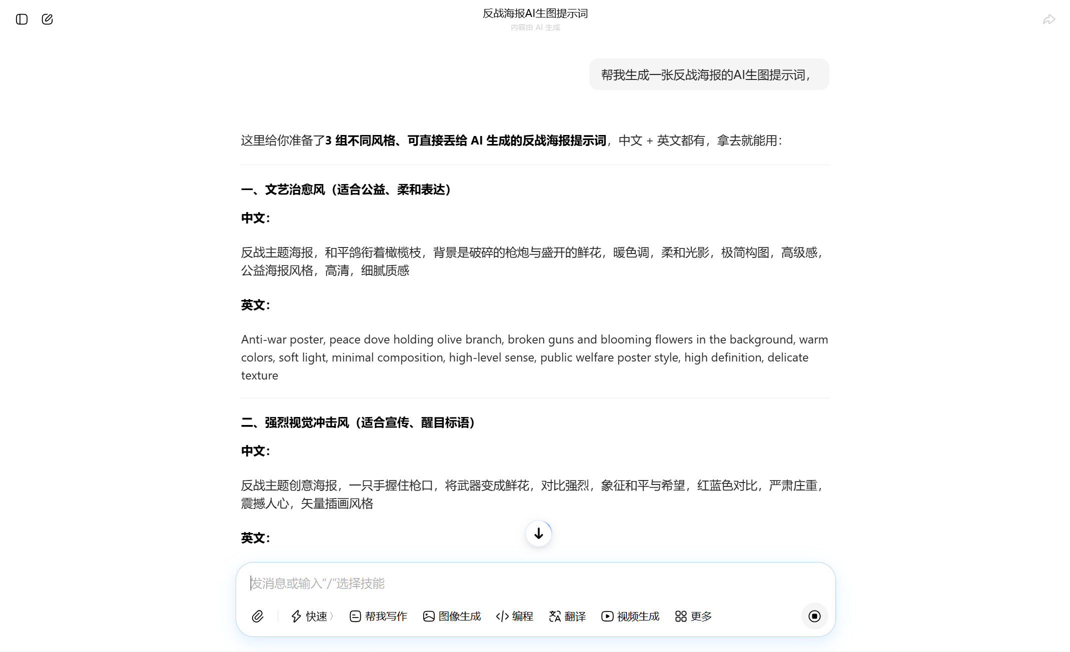 第一种方法,有想法,只需要AI进行绘制。这里我们可以先找一些大模型(豆包、元宝、千问等都可以,纯语言模型deepseek也可以),然后让他们生成一些AI提示词。