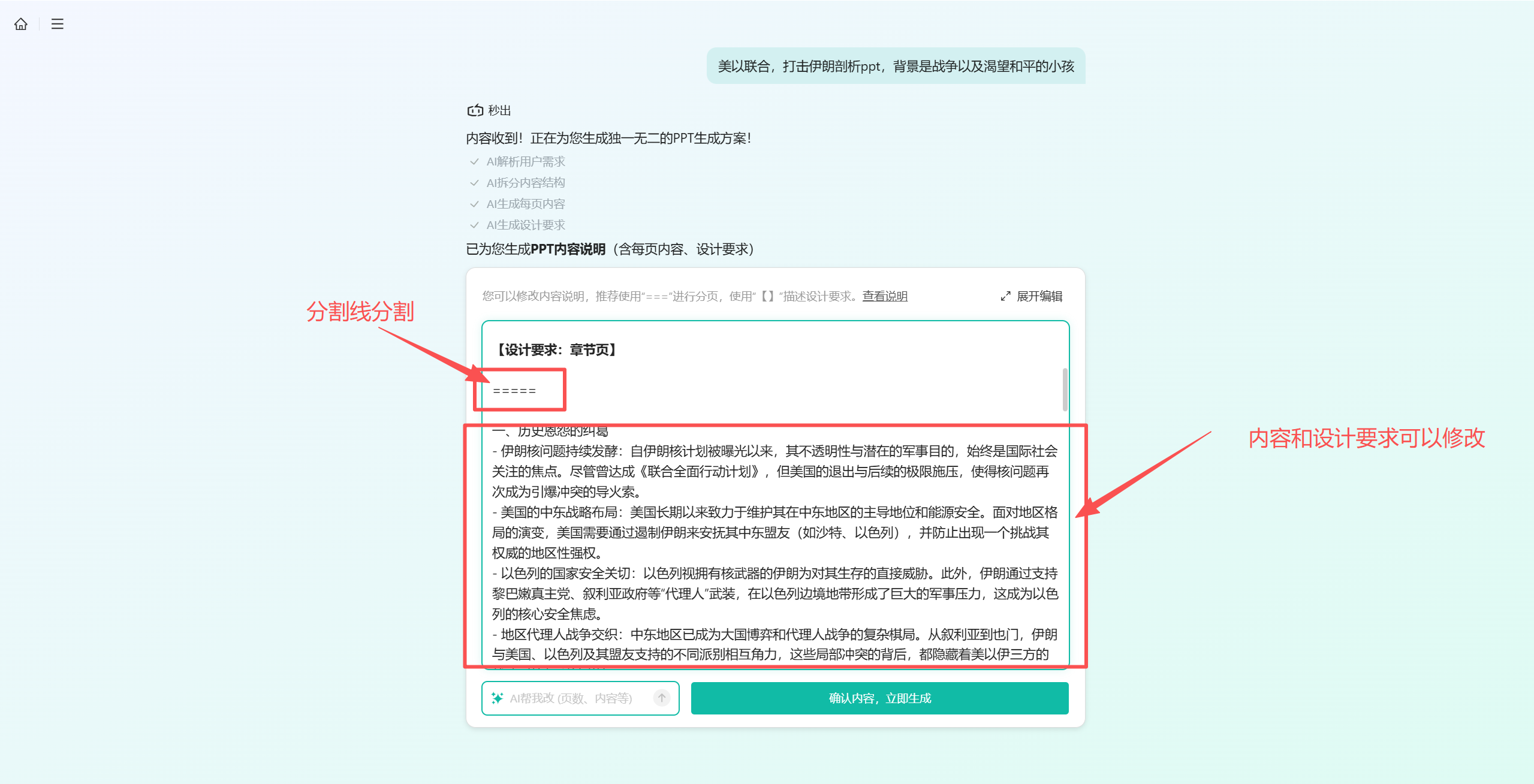 然后我们进入定制PPT的页面,秒出会先给到一份说明书。这份内容说明书是对于PPT内容和设计要求的说明,其中用分隔符将每一段分割,每一段是单页PPT的对应。我们可以直接修改单页PPT的内容和设计要求。如果觉得整个都不太行,那么还可以对话修改生成。