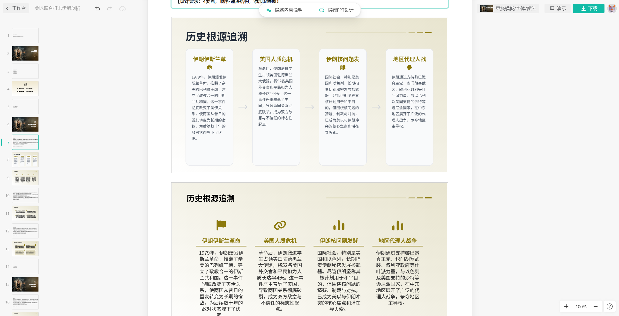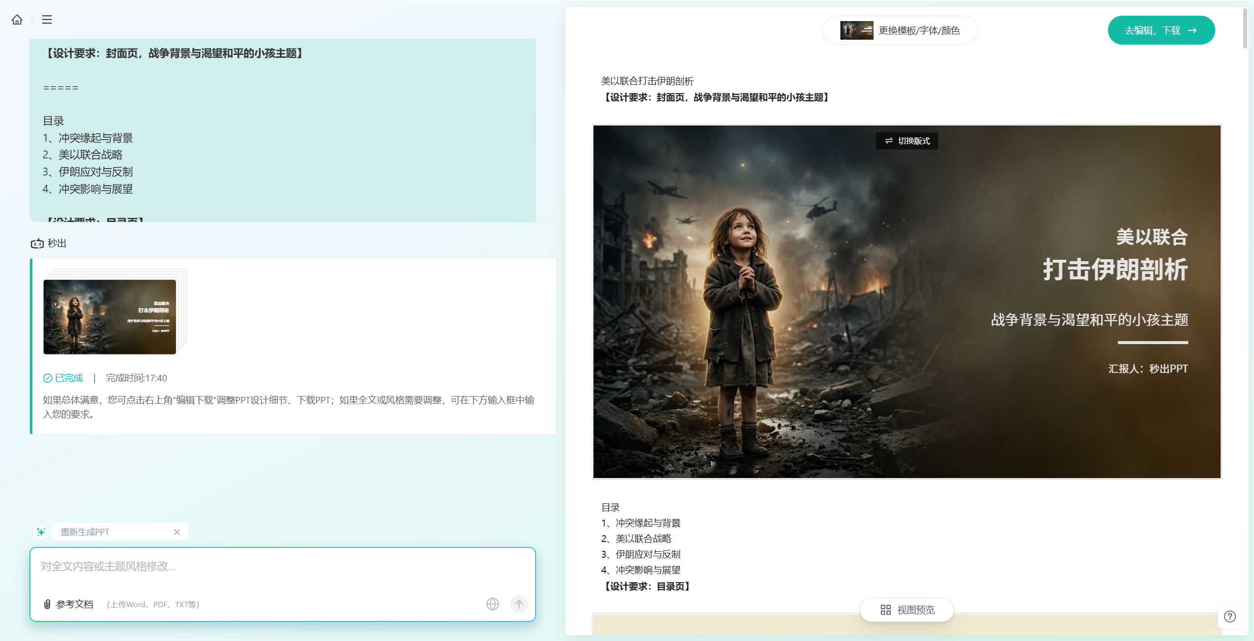 比如,这里我们就直接在秒出设计输入我们要做的某一个主题和要求“美以联合,打击伊朗剖析ppt,背景是战争以及渴望和平的小孩”。