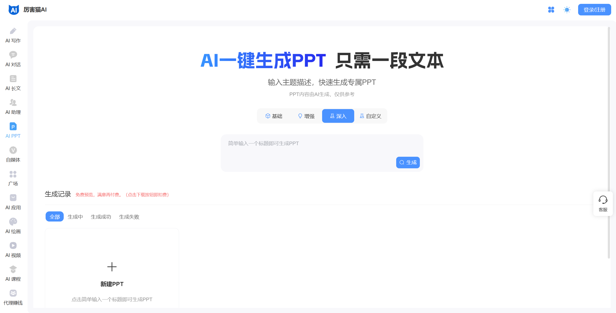 厉害猫AI PPT支持输入主题描述后快速生成PPT,功能简单,适合对PPT要求不高的用户。