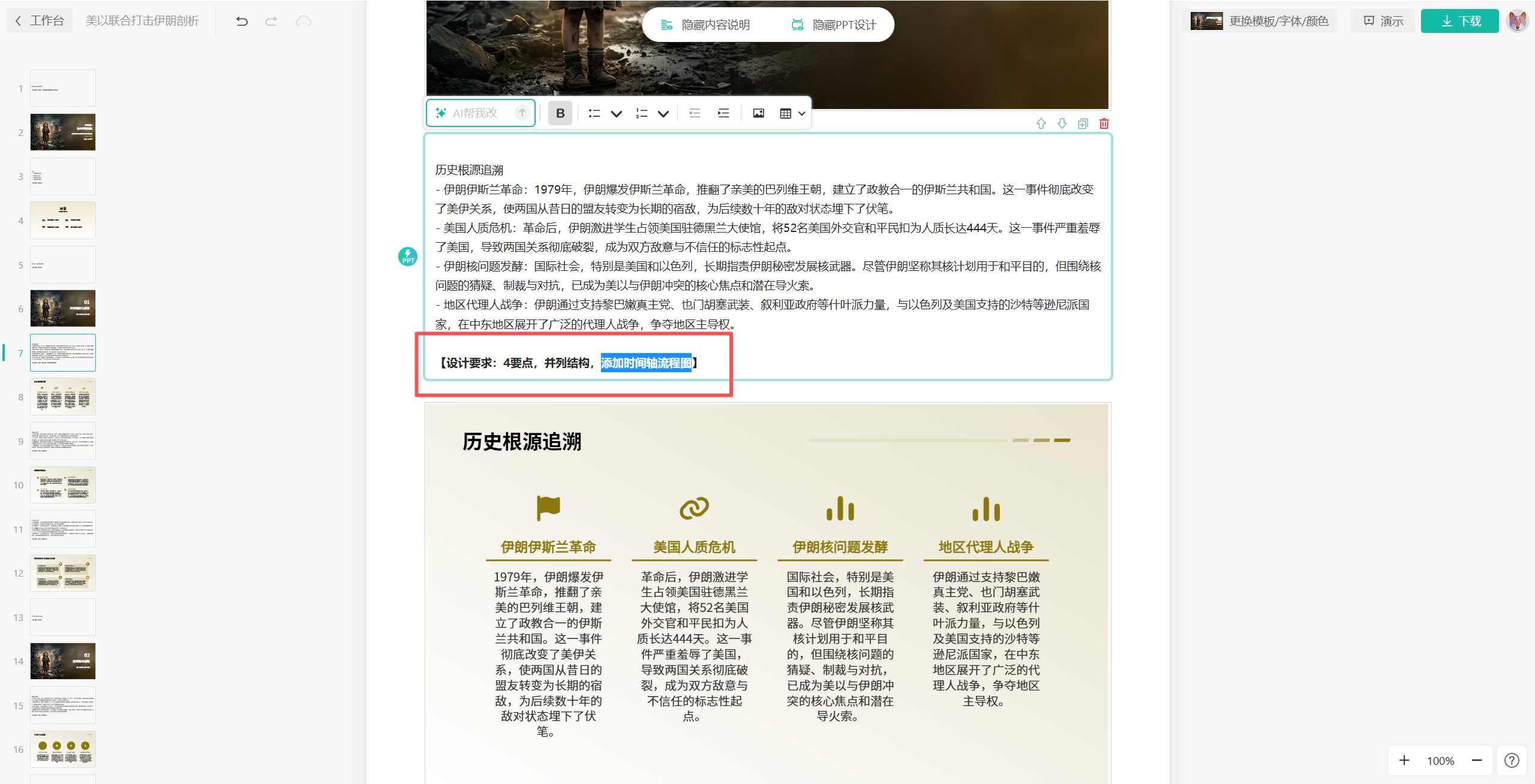 另外,就算是生成了,在编辑页面我们还支持深度定制。比如我们对某一个单页PPT不满意,那么可以在编辑页面,找到对应单页的说明文段,然后添加要求,AI就会开启深度定制,给我一个复杂的PPT。