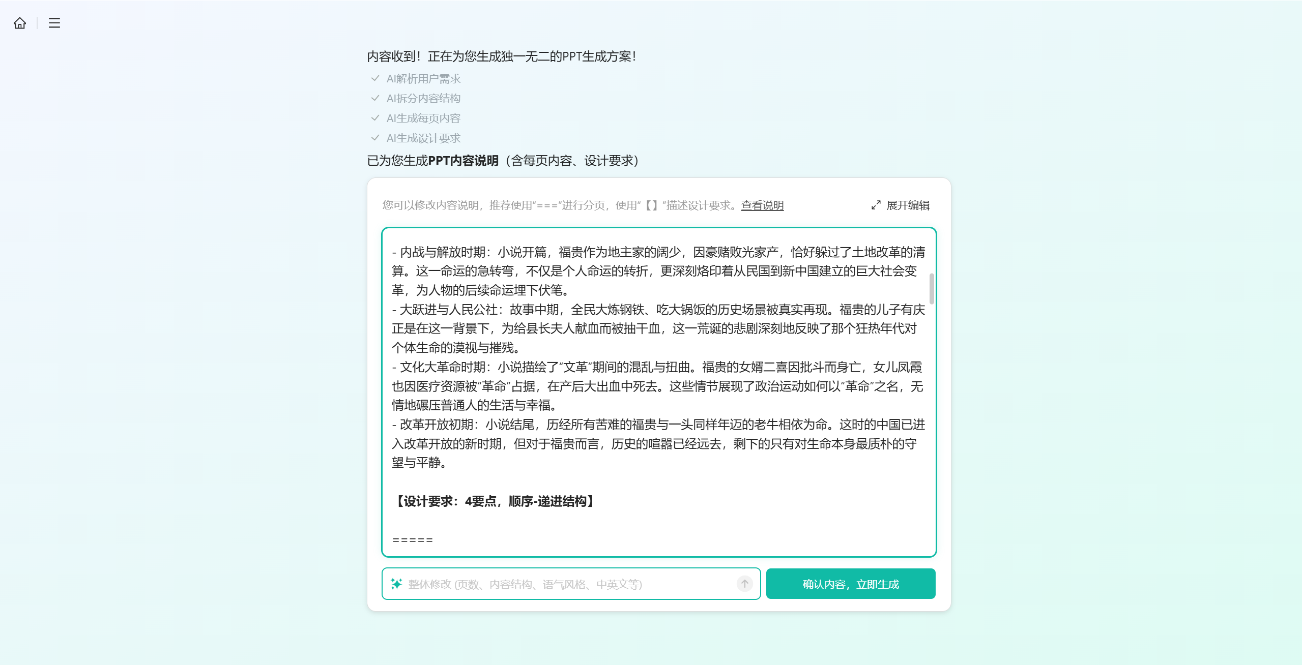 秒出PPT的精确复现能力很强。我们点击生成之后会先给到一份AI说明书,这份说明书每一部分用分割线分割,对应单页PPT的内容和设计要求。我们可以对说明书修改或者增删,之后就会根据要求来生成。