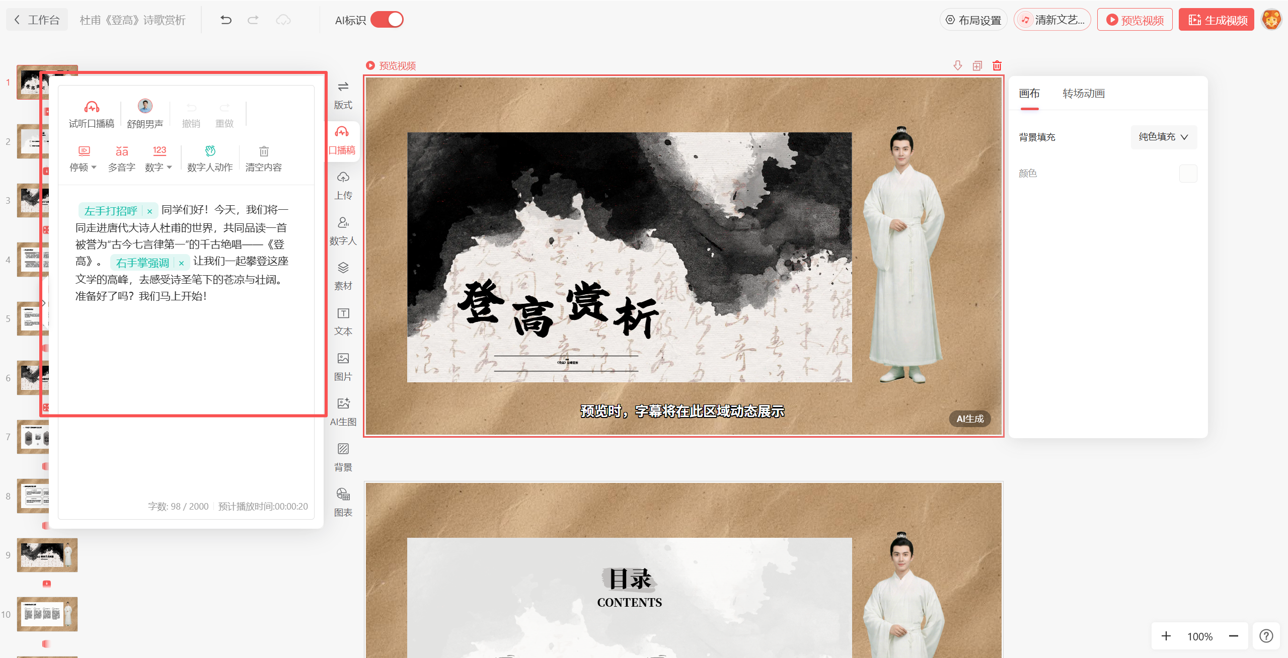 所有设置完成后,点击“生成”按钮,工具就会自动生成对应页面的口播稿和视频,全程无需手动操作。生成后大家可以逐页检查:每一页PPT对应的口播稿可以修改,比如调整表述方式、补充知识点细节;数字人的动作、表情也能按需更改;PPT的顺序、内容同样可以随时挪动、修改,灵活性极高,完全适配教师的个性化需求。