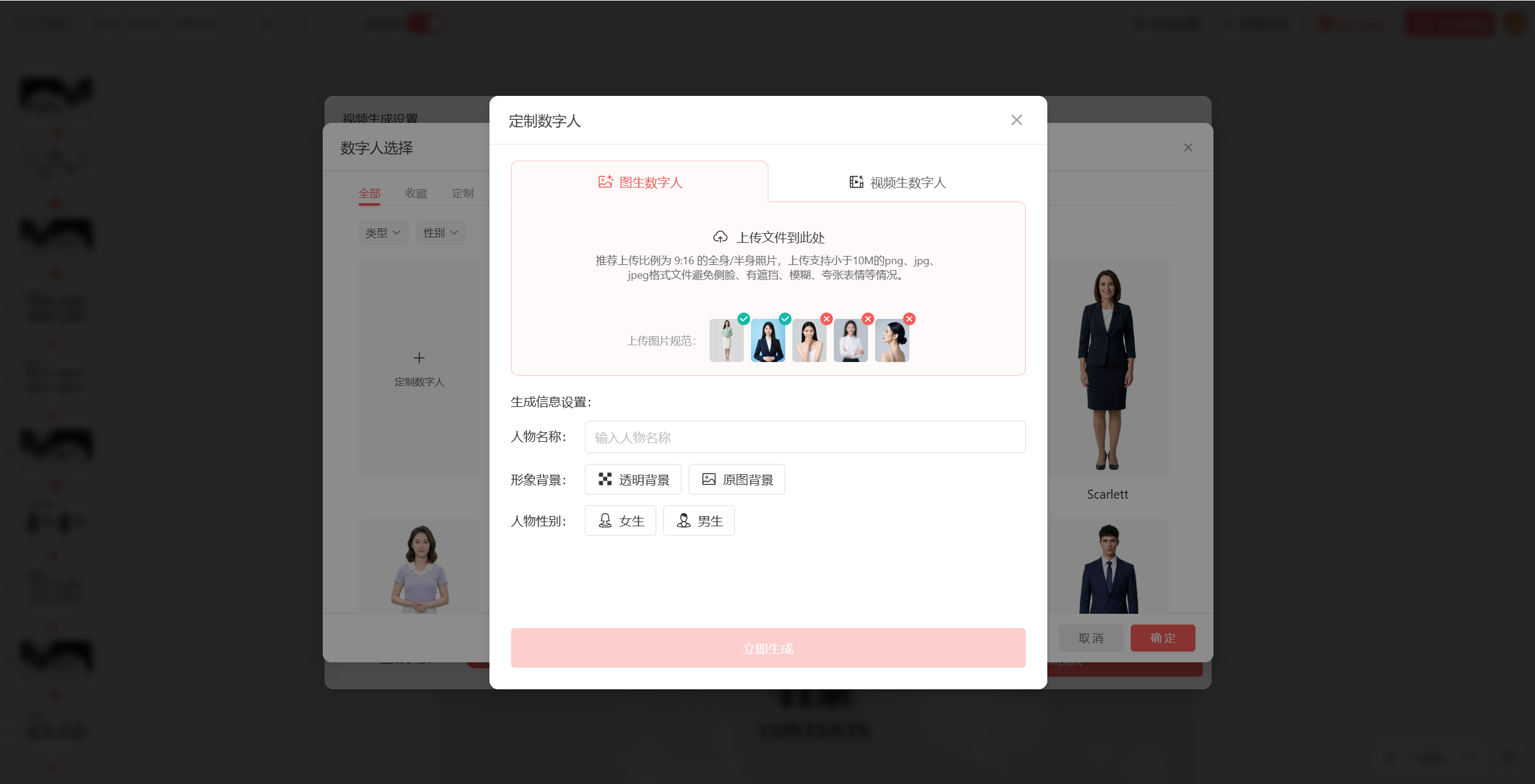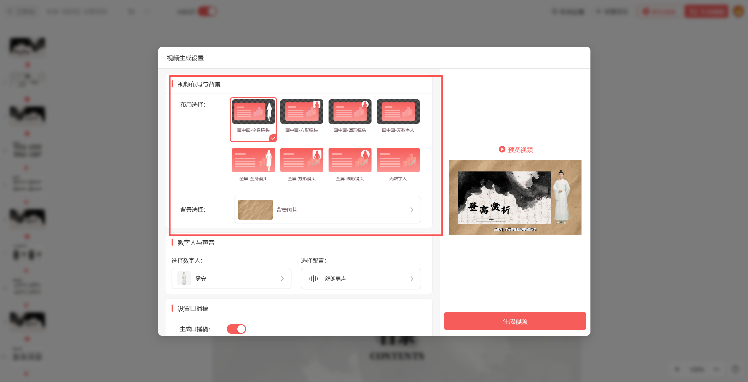 点击首页“创建”按钮,即可进入视频生成设置页面,这一步是决定微课效果的关键,大家可以根据微课主题和教学需求,逐项调整设置。首先是数字人布局,支持“全屏数字人”和“画中画”两种模式: