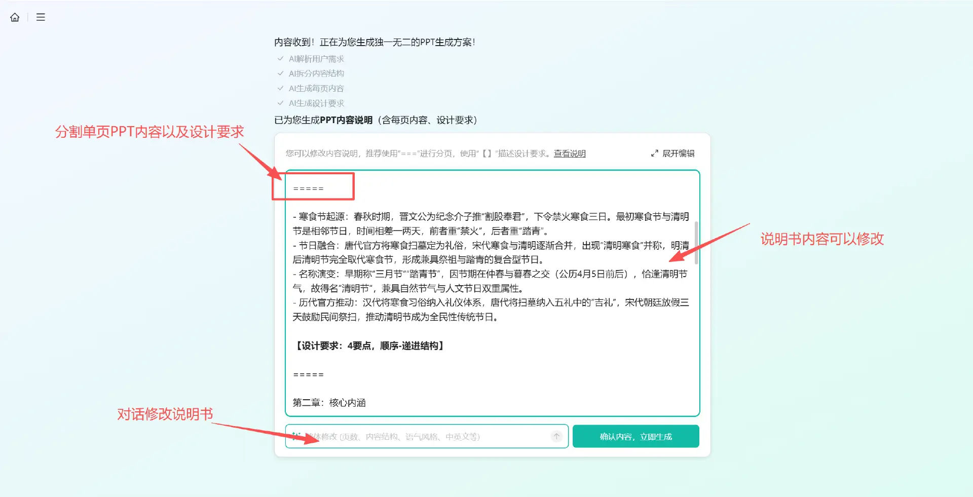 首先,用法还是在首页输入PPT主题或者是导入文档生成,这时候秒出PPT会先给到一份内容说明书,这份说明书用分割线将说明书的内容分割成一段一段的,每一段对应的都是一页单页的PPT内容以及设计排版要求。