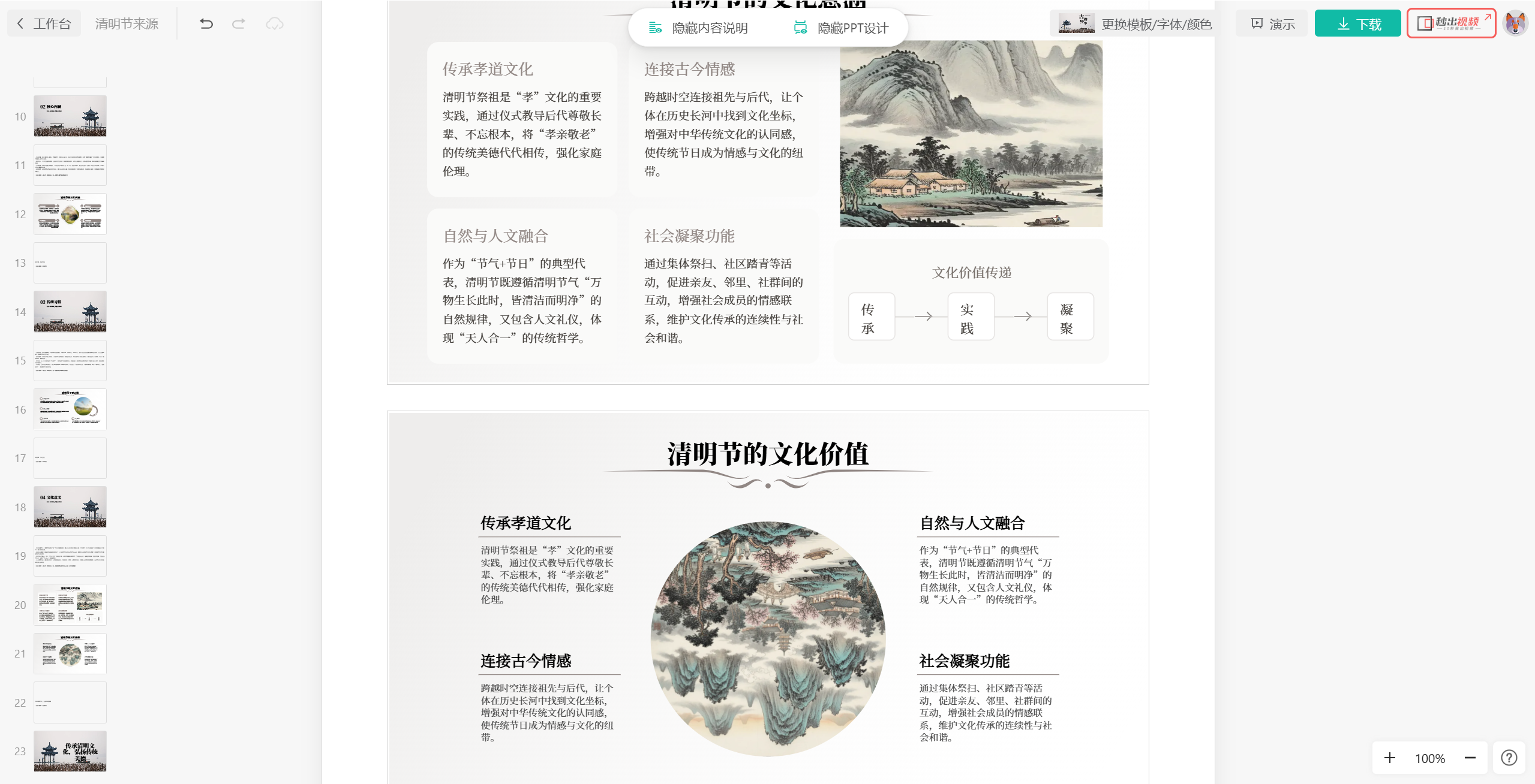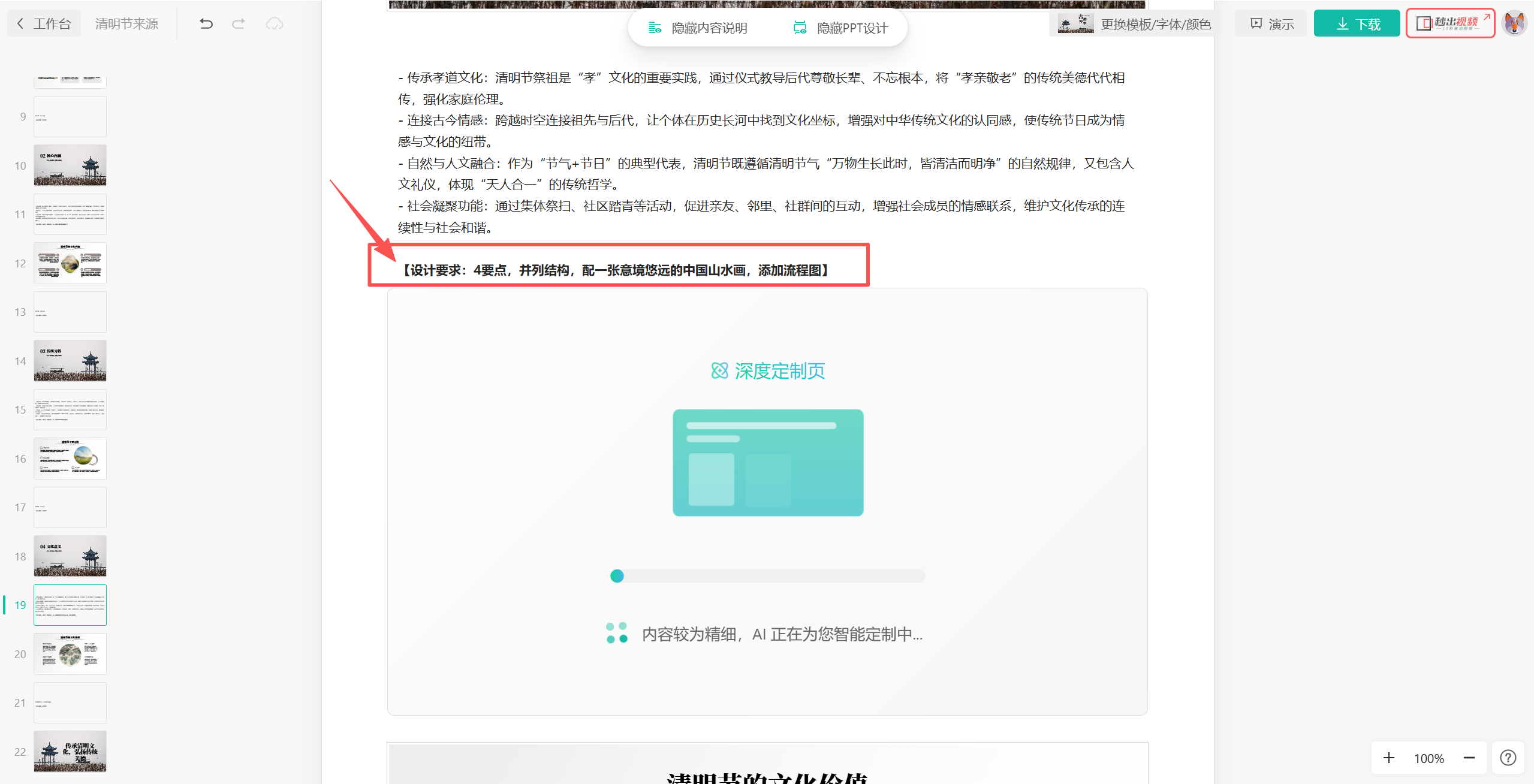 继续生成,AI会给到一份符合我们要求(也就是按照说明书设计要求和内容)来制作的PPT,如果我们还是觉得不太满意,那么可以在左边修改刚才的说明书重新生成。