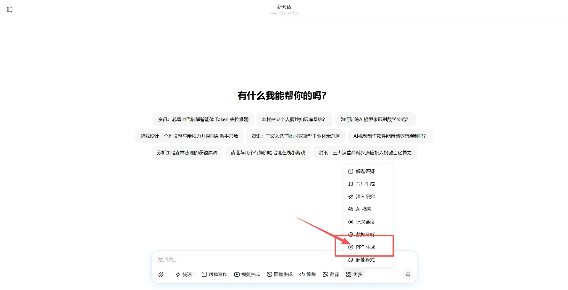做法也很简单,我们只需要打开豆包app或者是网页版,选择PPT生成模式,我们选好之后直接在输入框输入我们的主题即可。