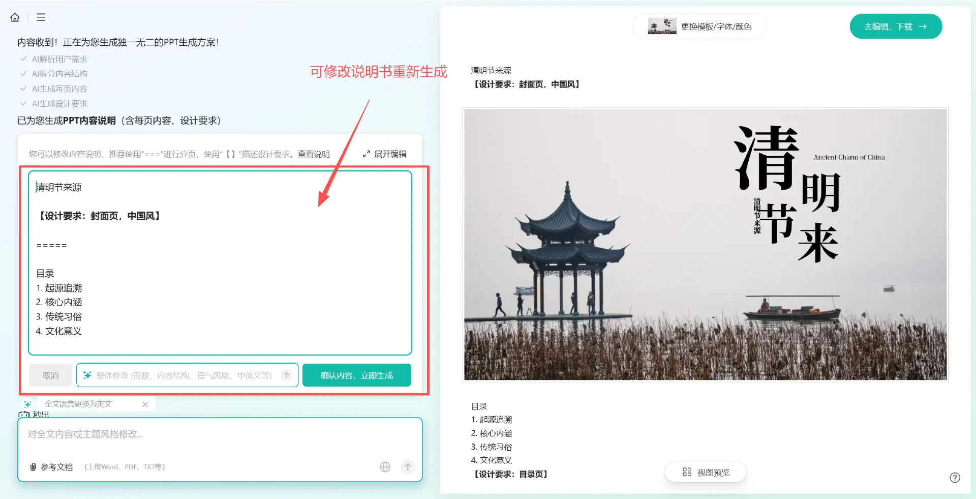 如果不满意还可以修改说明书来让AI生成自己想要的PPT;或者是对整个说明书不满意可以在左下角和AI对话修改整体。